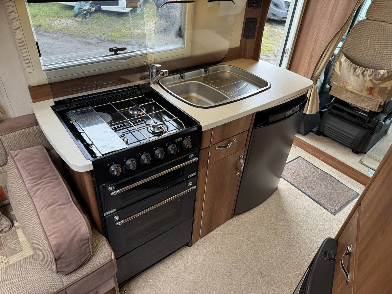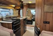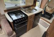 As we move through the motorhome we have the kitchen where there is a large Caprice oven with grille and 4 way gas hob, stainless steel sink with storage overhead and a Dometic 3 way fridge with freezer compartment.