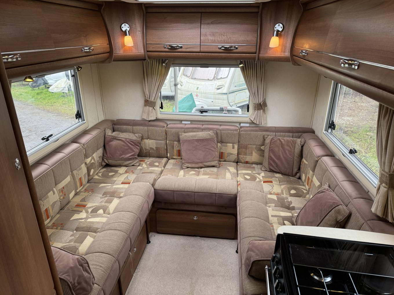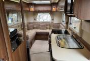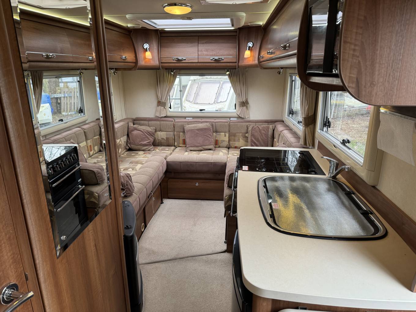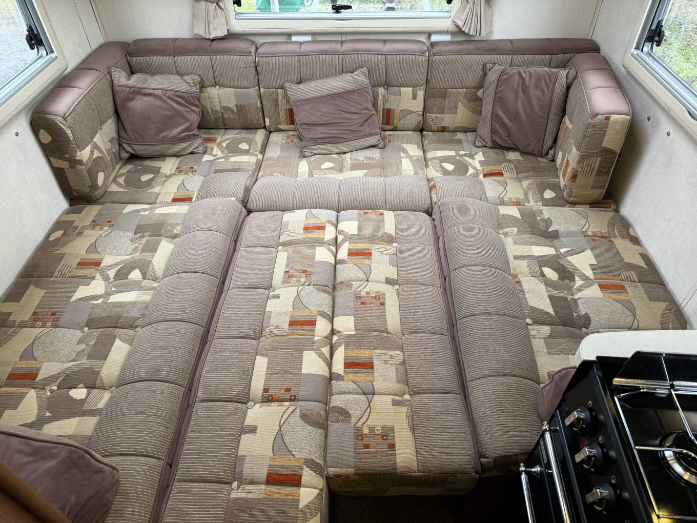 The layout of this motorhome is rear U shaped lounge. Starting with the rear of this motorhome, you have the highly desirable U shaped lounge, the light a cheerful fabric along with the large windows and roof lights that floods this room with natural light makes it a fabulous spot to relax and unwind in. The sofas converts to make an extremely large king size bed.