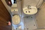 Opposite the kitchen is the large washroom where the sink panel swings open to create a full length separate shower, a Thetford toilet cassette, washbasin with mixer tap and a full size wardrobe with drawers and cupboards.