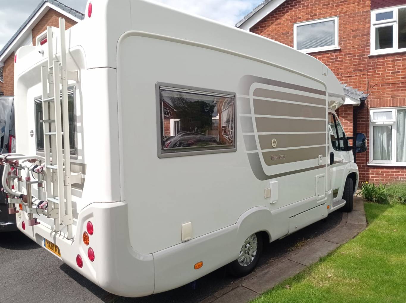 Above the cab is additional storage lockers and below in the cab, the vehicle has a manual gearbox and a radio, air conditioning and reversing camera along with electric windows and mirrors. Externally there is a wind out awning to allow al fresco dining as well a bike rack which can carry up to 2 bicycles at any time.
