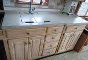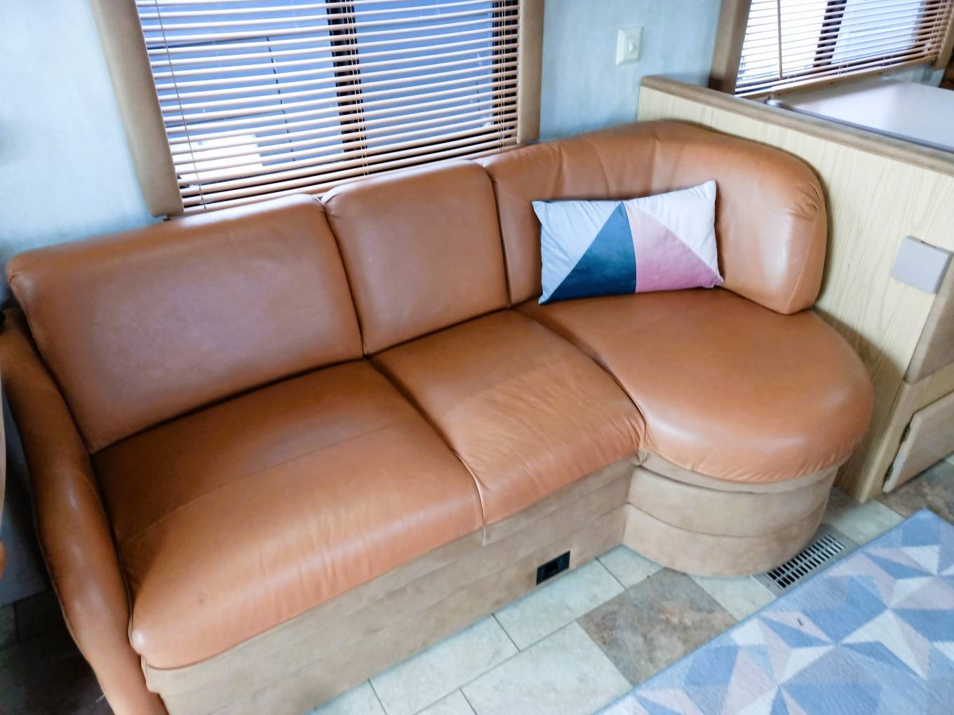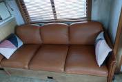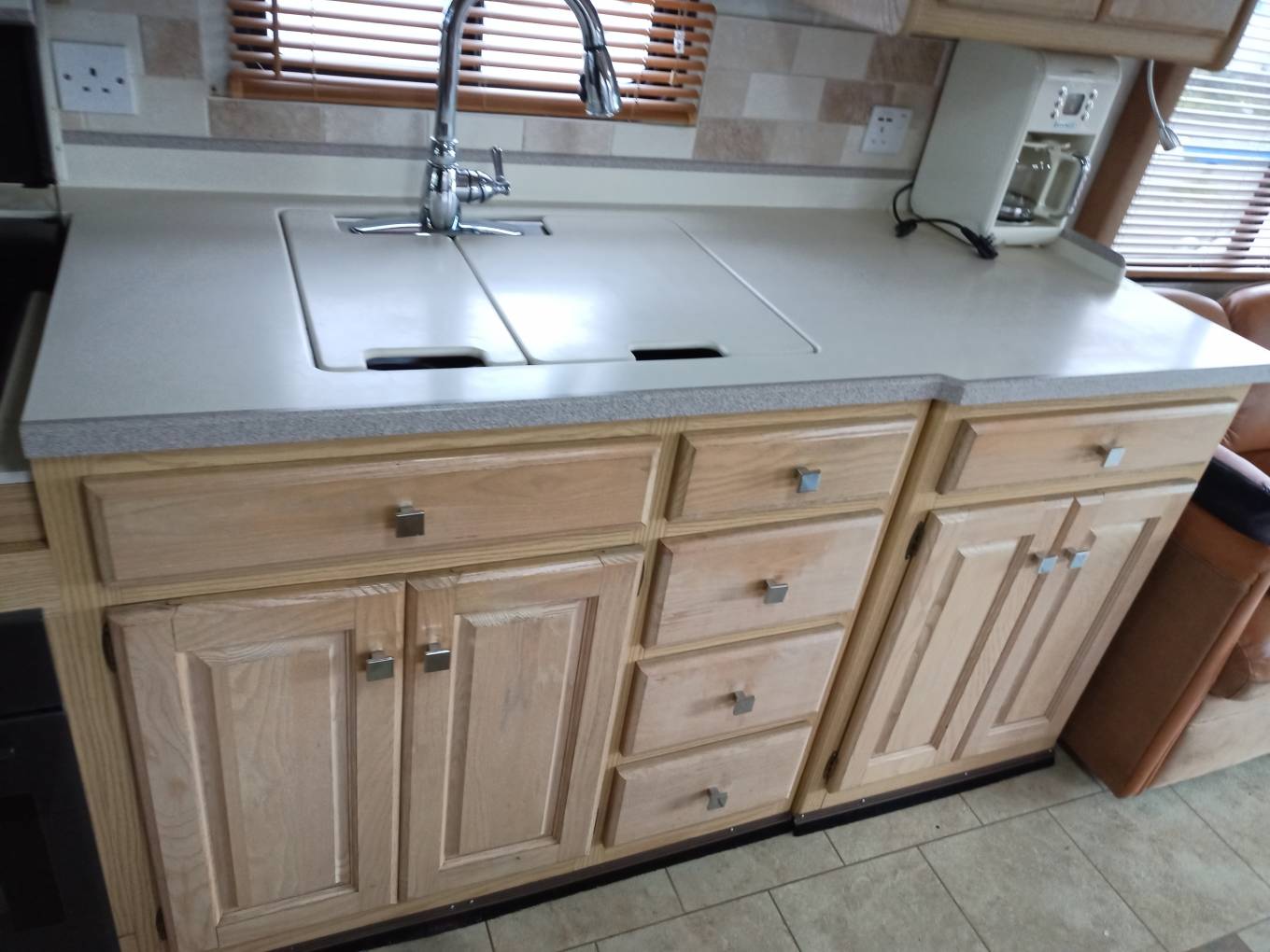The Diplomat model features a slide out, rear island bed, with two additional sofa bed double berths. There is a fully featured kitchen with hob, grill, oven, microwave, extractor fan, and spacious sink and drainer. There is a good sized dinette seating area. Both cab seats swivel, and this RV can easily accommodate a dozen people in its social space, which whilst already large is made even more spacious by the nearside slide-out.