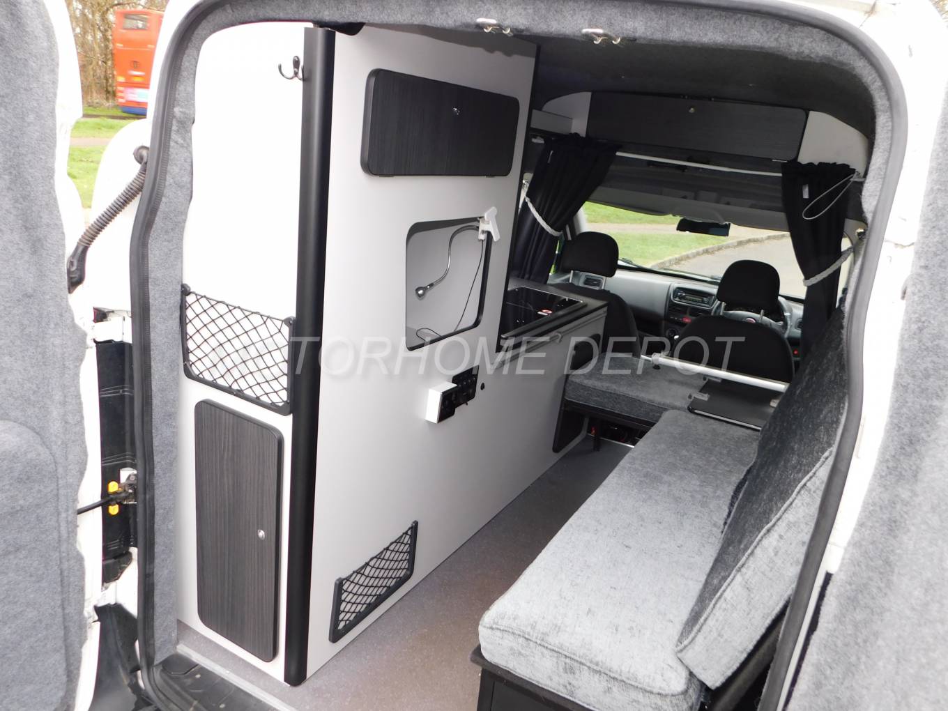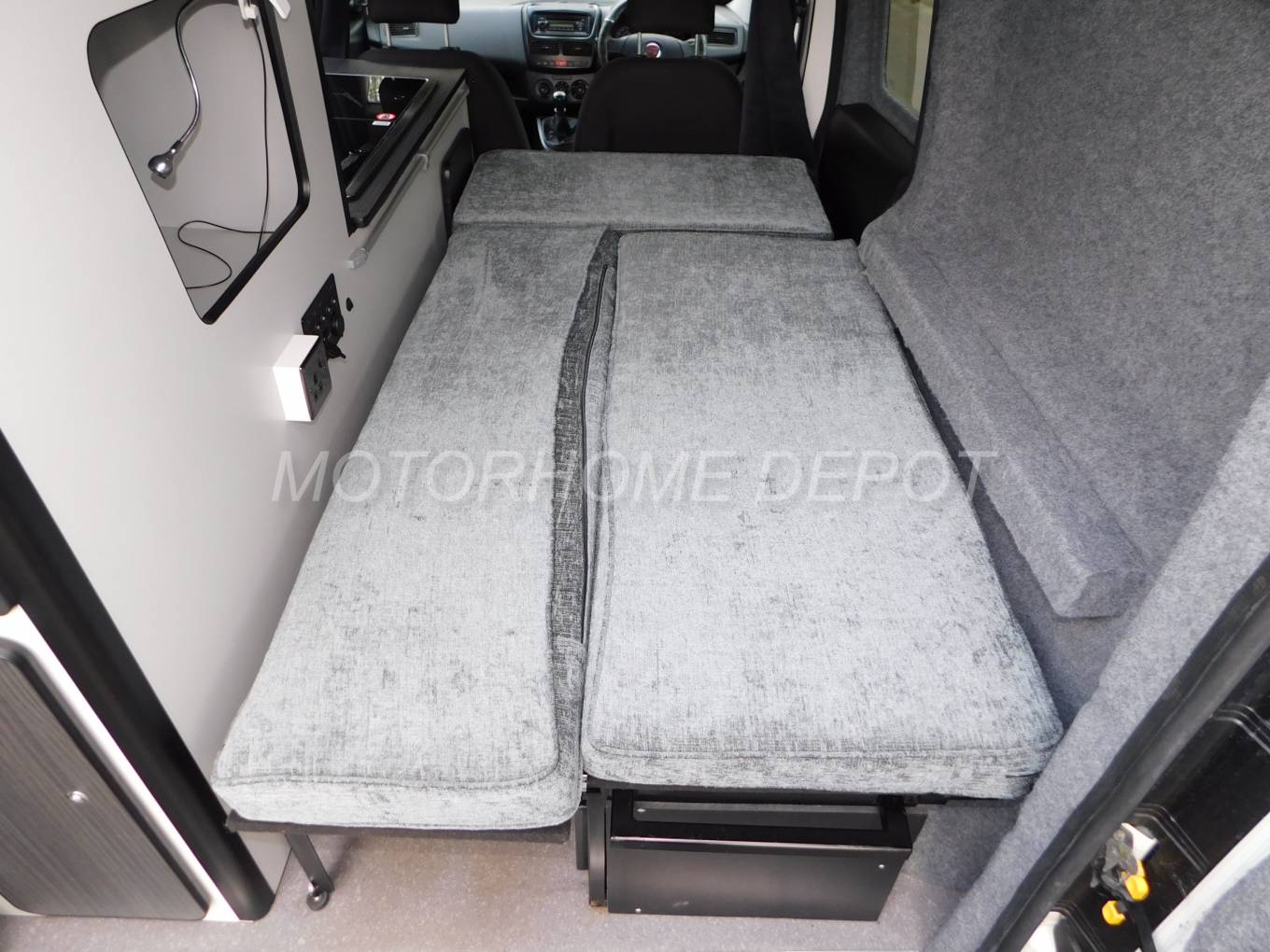 - Enter using the rear doors and you have a long comfortable side sofa, which when pulled across creates a double bed - (6ft 2" x 3ft) (1.88m x 0.92m). An additional storage locker below and under seat storage.