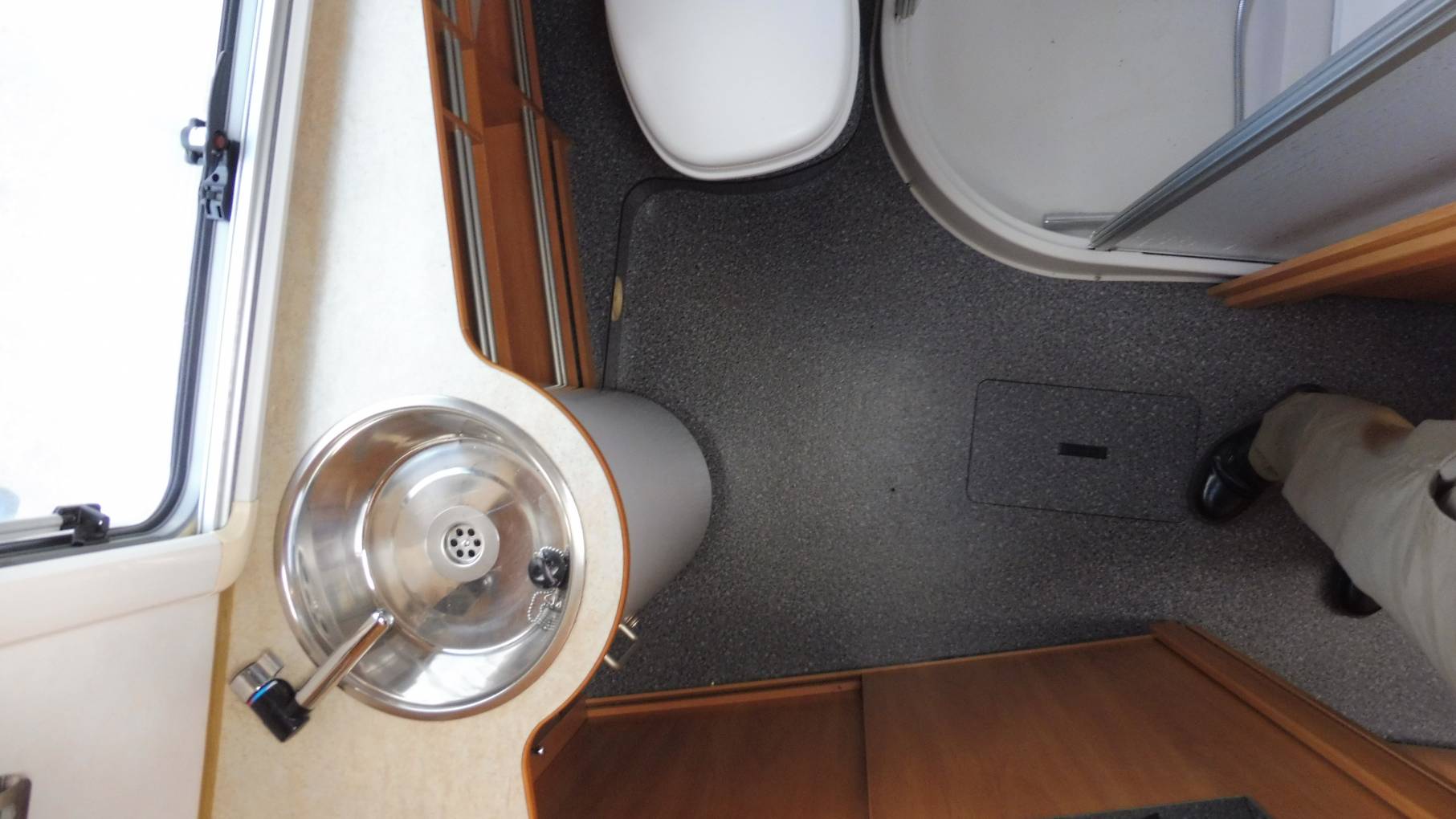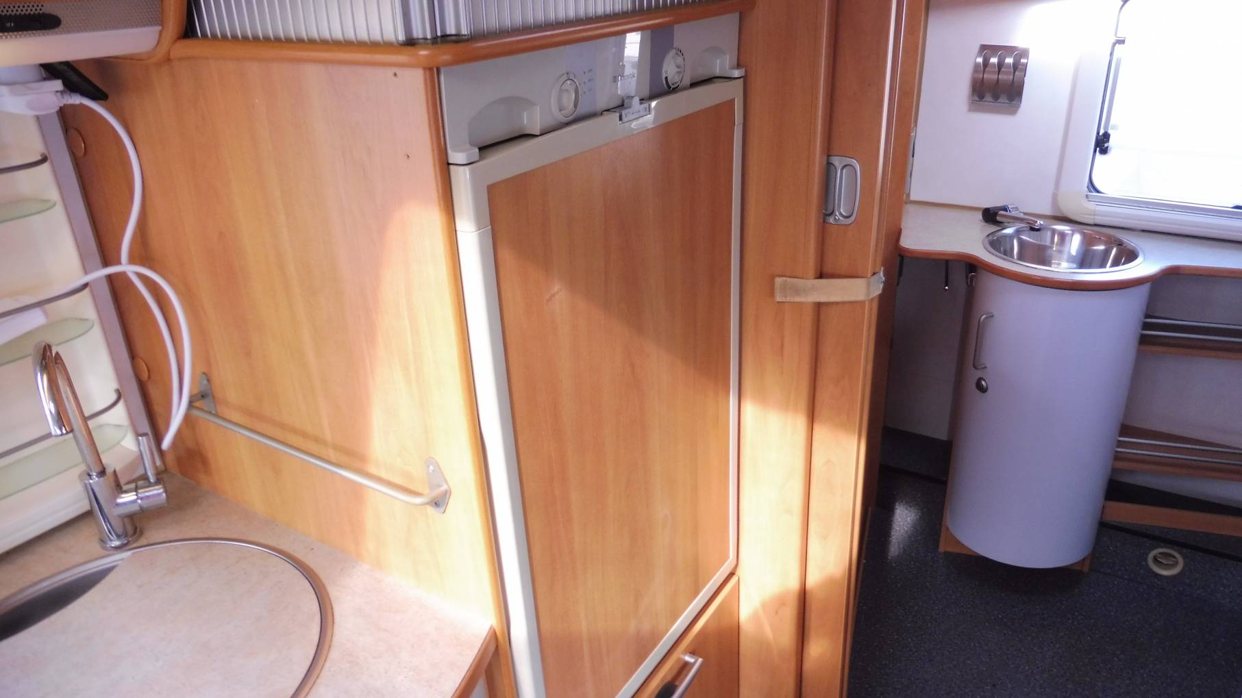 The side kitchen is well equipped with 3-burner hob, SMEV combi-oven, 3-way fridge and plenty of storage space. There is a tambour-door cupboard which could house a microwave or television as appropriate.