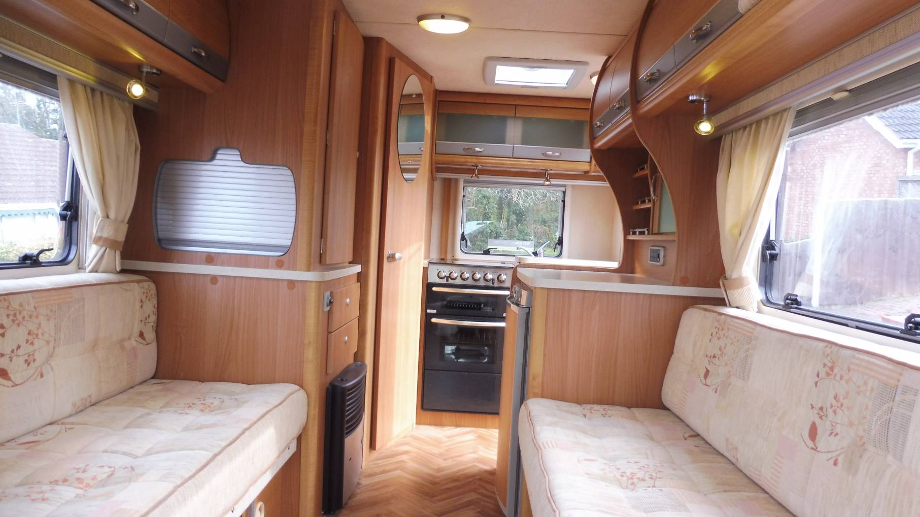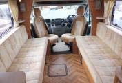 Moving forward the Stargazer has two sofas running down the sides of the motorhome which provide the perfect place to put your feet up and relax with a cup of tea and a good book, or something stronger if you prefer. With the two swivelling captain’s chairs, this provides additional comfort and seating space. Generous windows and a skylight allow natural light to flood in. The motorhome comes with a fold-up table and creates an ideal dining space for up to 6 people.