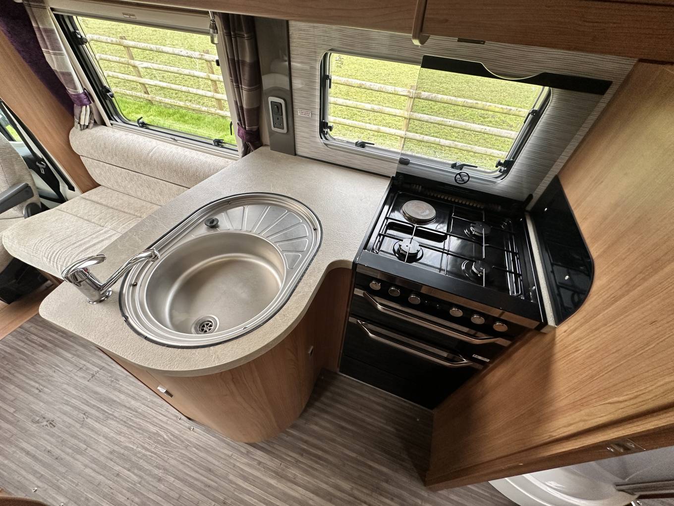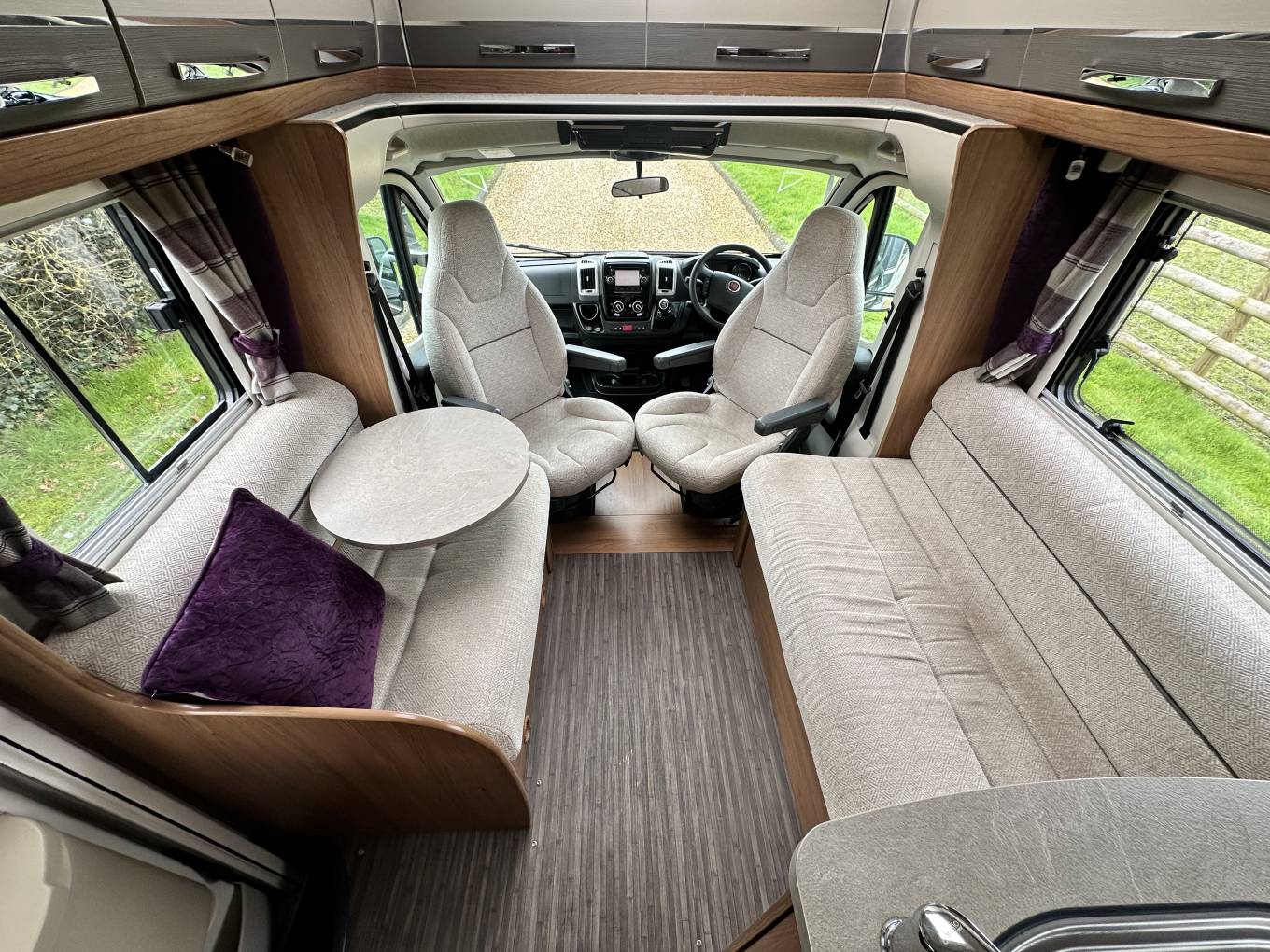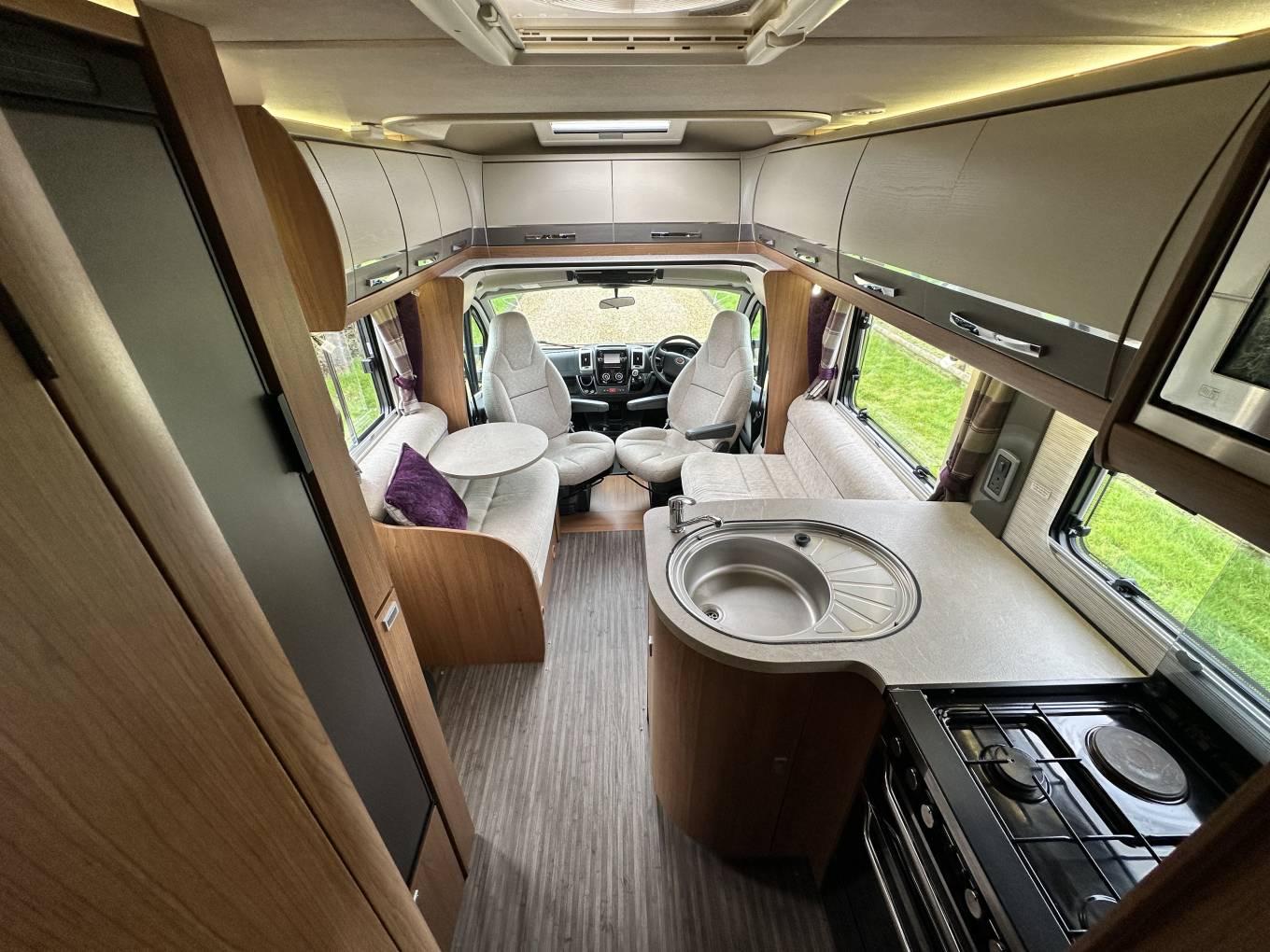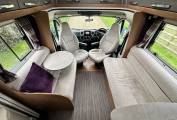 To the rear is the ever popular fixed island bed. You will also find lots of storage space in the wardrobe and under the bed. The rear closes off from the rest of the Motorhome creating an en-suite feel. There is a separate shower cubicle as well as a separate washroom with a toilet and wash basin. Next, is the well equipped kitchen. In there you will find a large fridge freezer, gas hob, electric hot plate, microwave, oven, grill and wash basin. To the front is the most comfortable dinette area which seats 4 perfectly and converts to a double bed.