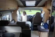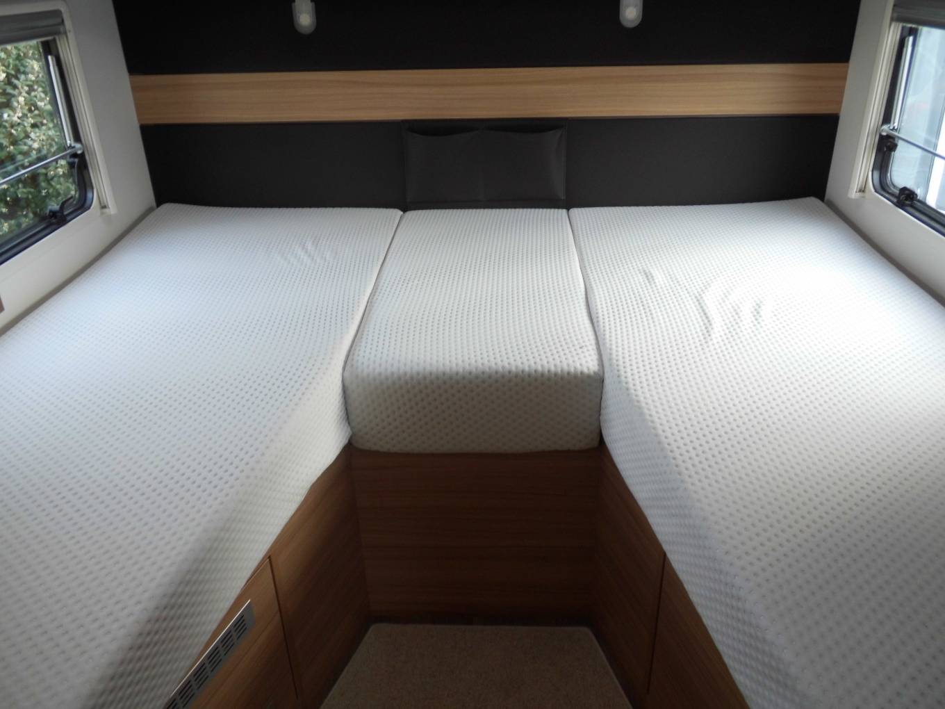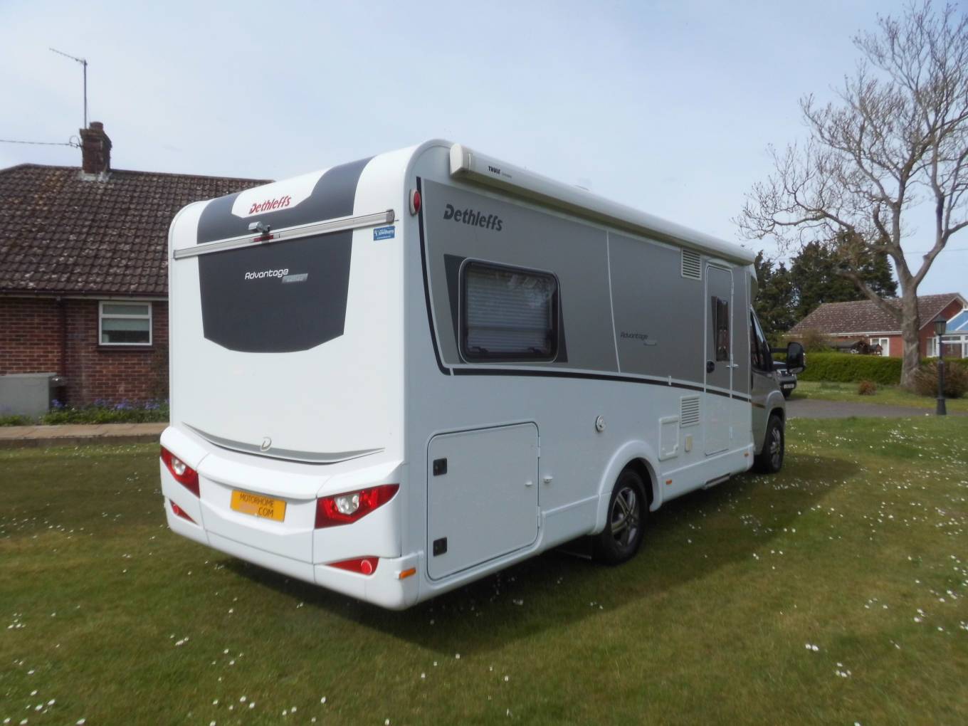 Dethleffs Advantage T7051A, Rear fixed single beds, with dinette area that converts to a bed suitable for one adult or two children. Mid ships galley kitchen with separate shower and wash room toilet opposite, this area can be closed off to form a rear bedroom with en-suite facilities. Dethleffs Advantage Special Edition 7051A, motorhome built to give a little more space and comfort. It is a 3 berth, 4 belted motorhome, still with the original first owner, On entering the habitation area, there is a light and airy feel throughout the motorhome partially due to the large central rooflight. The lounge and dining area consisting of twin belted forward facing seats, twin swivelling cab seats and single seat just to the right of the door as you enter. With the swivel seats it makes a larger al social area for 5 people. All the windows have blinds, screens and curtains and there is a tv which is hooked up to the satellite system this motorhome comes with. This area also converts into a single bed. In the centre of the motorhome is the kitchen consisting of a three-burner gas hob, sink, oven/grill combo and on the opposite side a large slimline three energy source Fridge/Freezer. There is plenty of storage and a pull out surface for food prep etc. LED lighting all around. This motorhome is ready to go, two gas bottles which slide out on a platform, and an outside BBQ gas point. The large garage area has full access via one metre high doors on both sides and has fittings to tie down any stowed items under the double bed above.