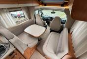 Towards the middle of the motorhome is the well-equipped kitchen that include a 3 gas burner, hot and cold mixer tap with internal water pump, a large 3-way fridge with separate freezer space, oven & grill and plenty of additional storage space. Moving to the front of the Motorhome you have the spacious lounge area this is built up of an L shaped bench that houses 2 additional 3-point seatbelts and a side facing bench fixed around a great sized dinette table. This area also doubles up into a large bed by dropping the table and using the infill cushions. The front seats also swivel around to face the lounge area to offer more seating space.