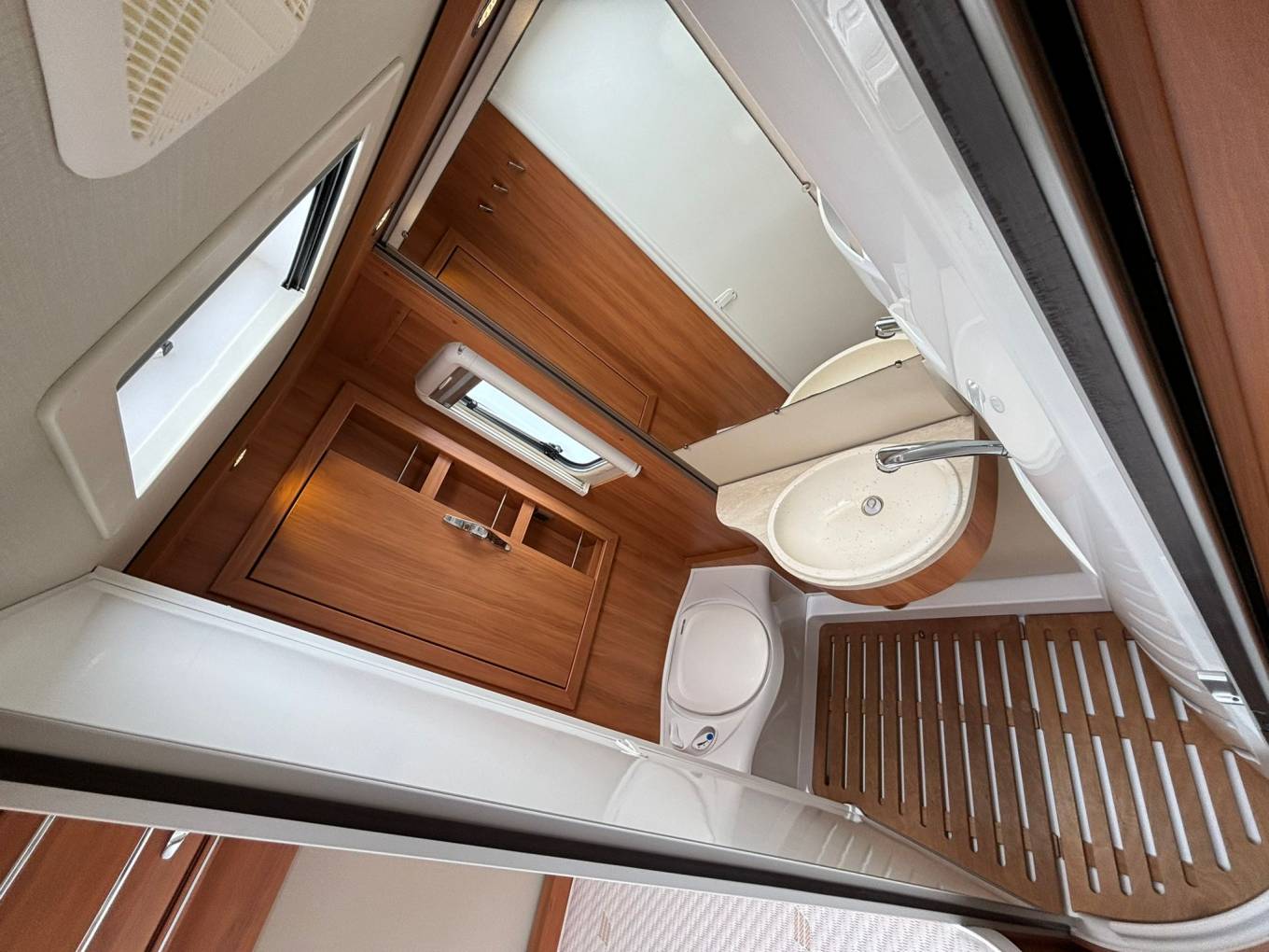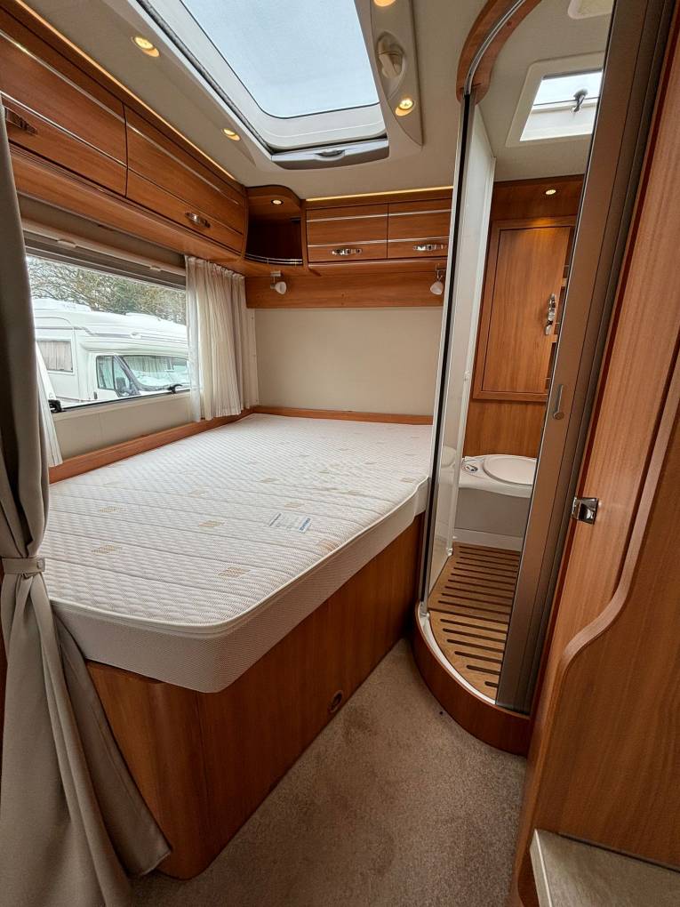 Layout - Starting at the rear you have the good sized double French Fixed Bed a popular feature that also offers you plenty of storage space underneath which can also be accessed from outside the motorhome. Continuing at the rear we have the large washroom that has a retractable shower head, toilet cassette, washbasin and vanity mirror.