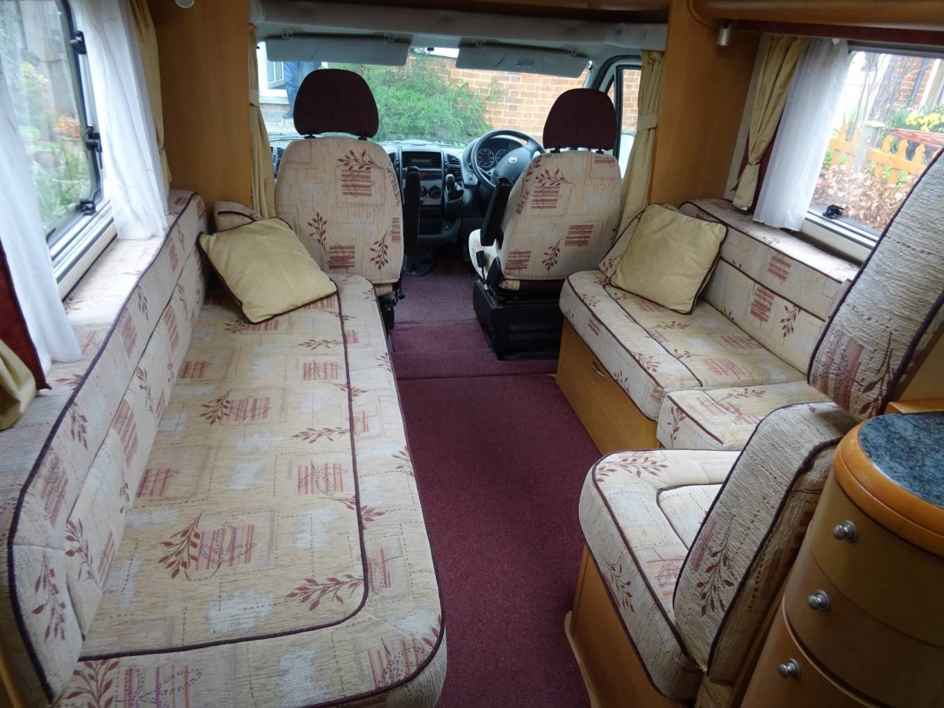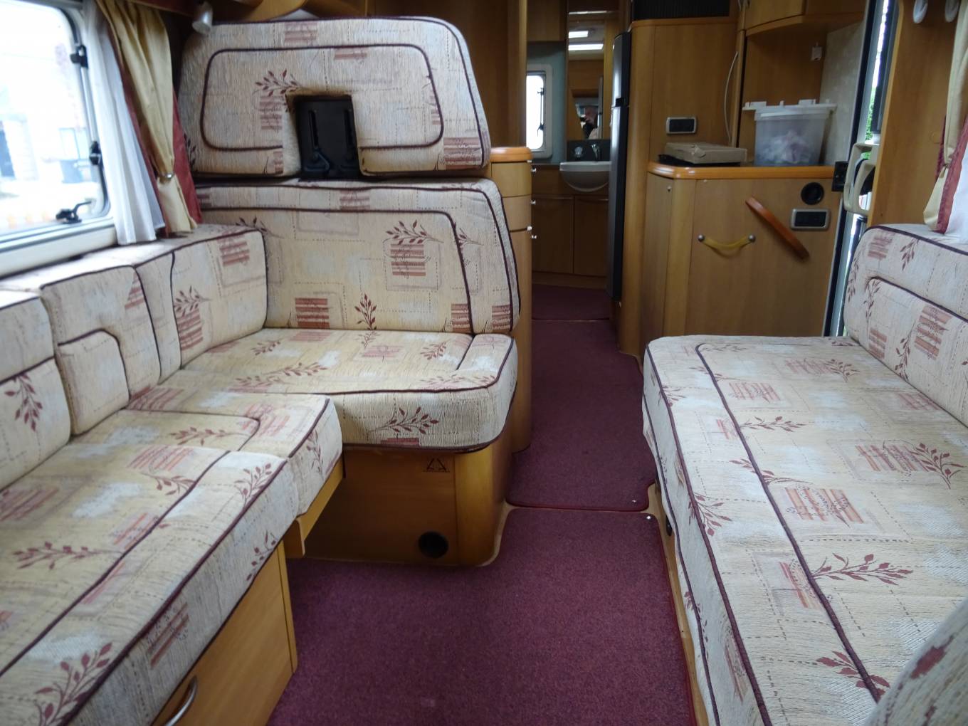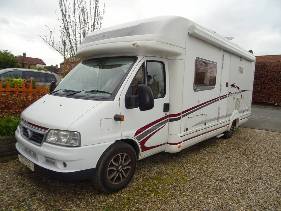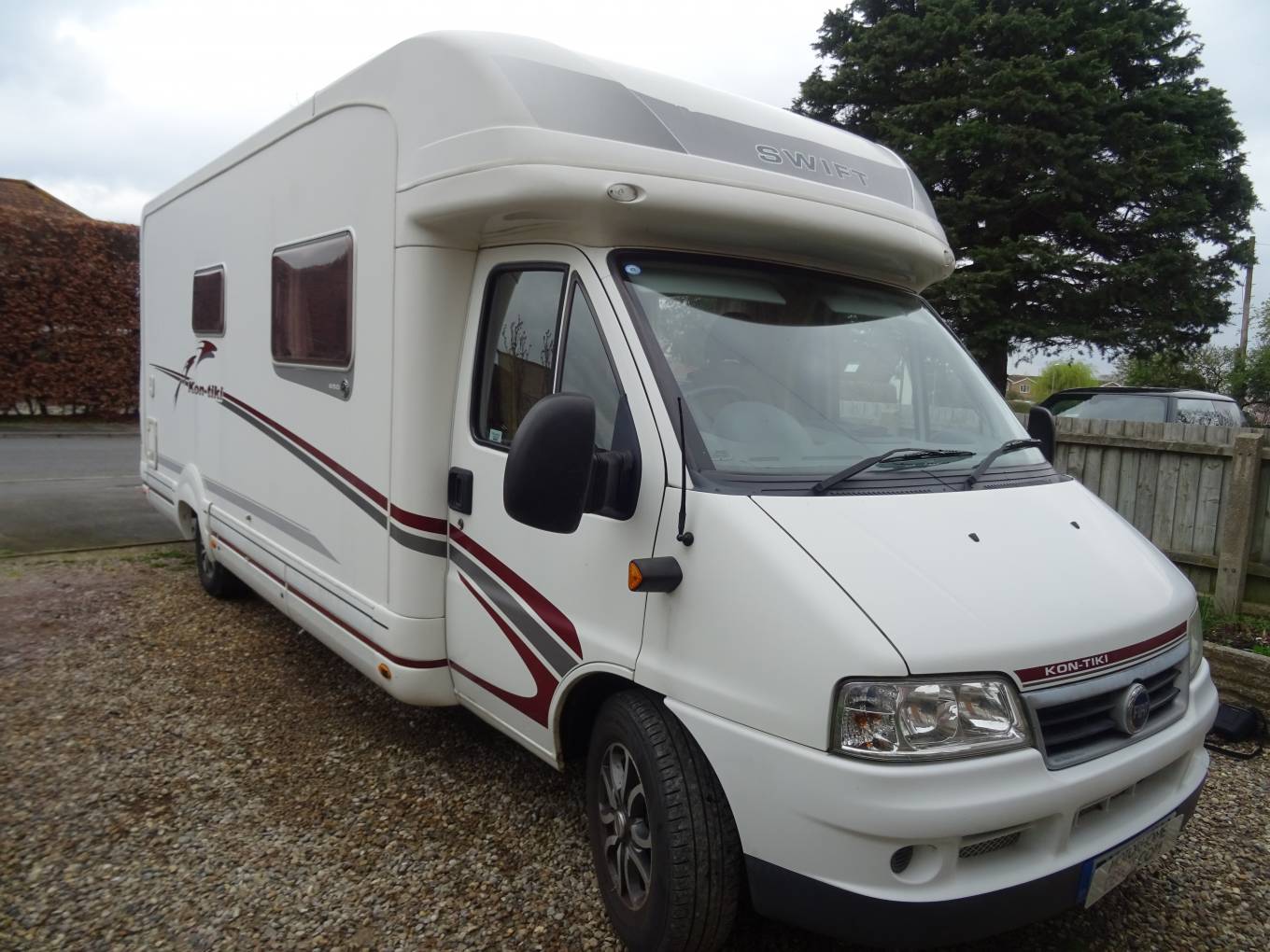 Swift Kon-tiki 650 2006 2 berth with only 2 former owners weight is 3850kg and you will need C1 licence with 57118 miles it had the timing belt changed in 10/2021. TO POINT OUT that this motorhome has got a few areas with higher moisture readings this is reflected in the price. Please ask for further details. This 2 berth motorhome is very spacious with the large washroom at the end which has a fully enclosed shower, toilet, sink and hanging space, there is a privacy door which separates the washroom from the rest of the motorhome. The central kitchen includes a cooker with oven, grill 3 gas burners and electric ring, microwave and extractor fan and lighting. Opposite is a large fridge with separate freezer and above this you will find an area for a TV. Moving to the front there is a large sofa area with 2 forward facing travelling seats with full seatbelts. The sofas can either be used as single beds or they come together to create 1 large double. Upfront both seats swivel, there is a 5-speed manual gearbox. Throughout the upholstery is in good condition. Other features 2 bar bike rack, alloy wheels incl the spare, electric step and the carpets are removable. There is also a side locker that is ideal for storing wet clothing or equipment plus there is underfloor storage that runs the whole width of the motorhome which is accessed by locker doors.