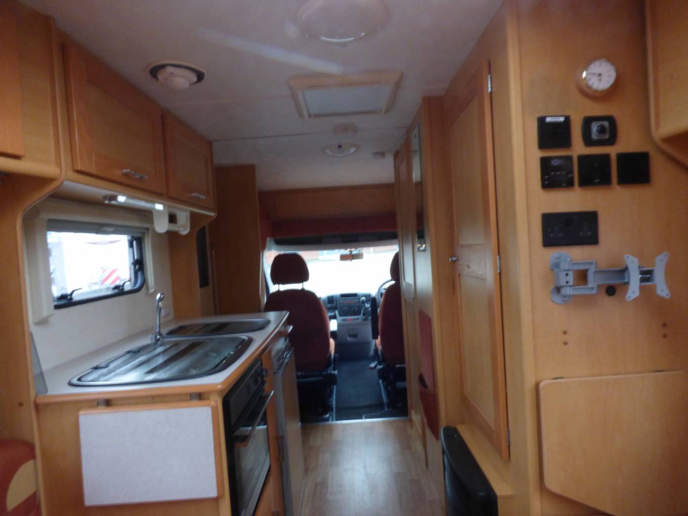 The cab has a five speed manual box and electric windows and mirrors. To the rear is a 2 bike rack and a wind out awning. The length is sub 6 metres and weight is 3000kg which means any full driving licence is suitable.