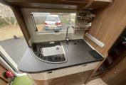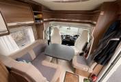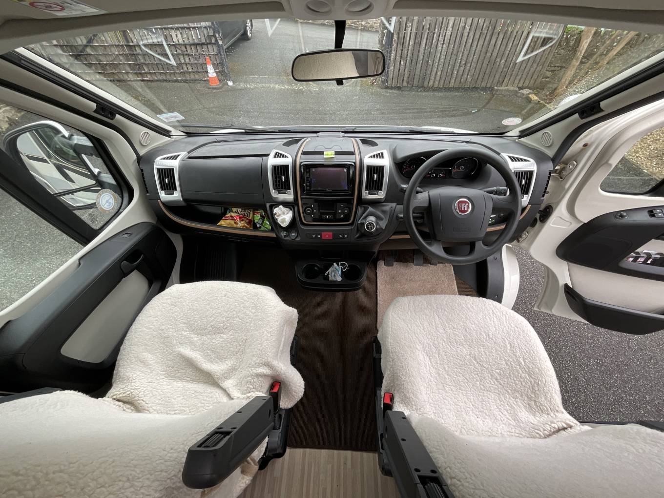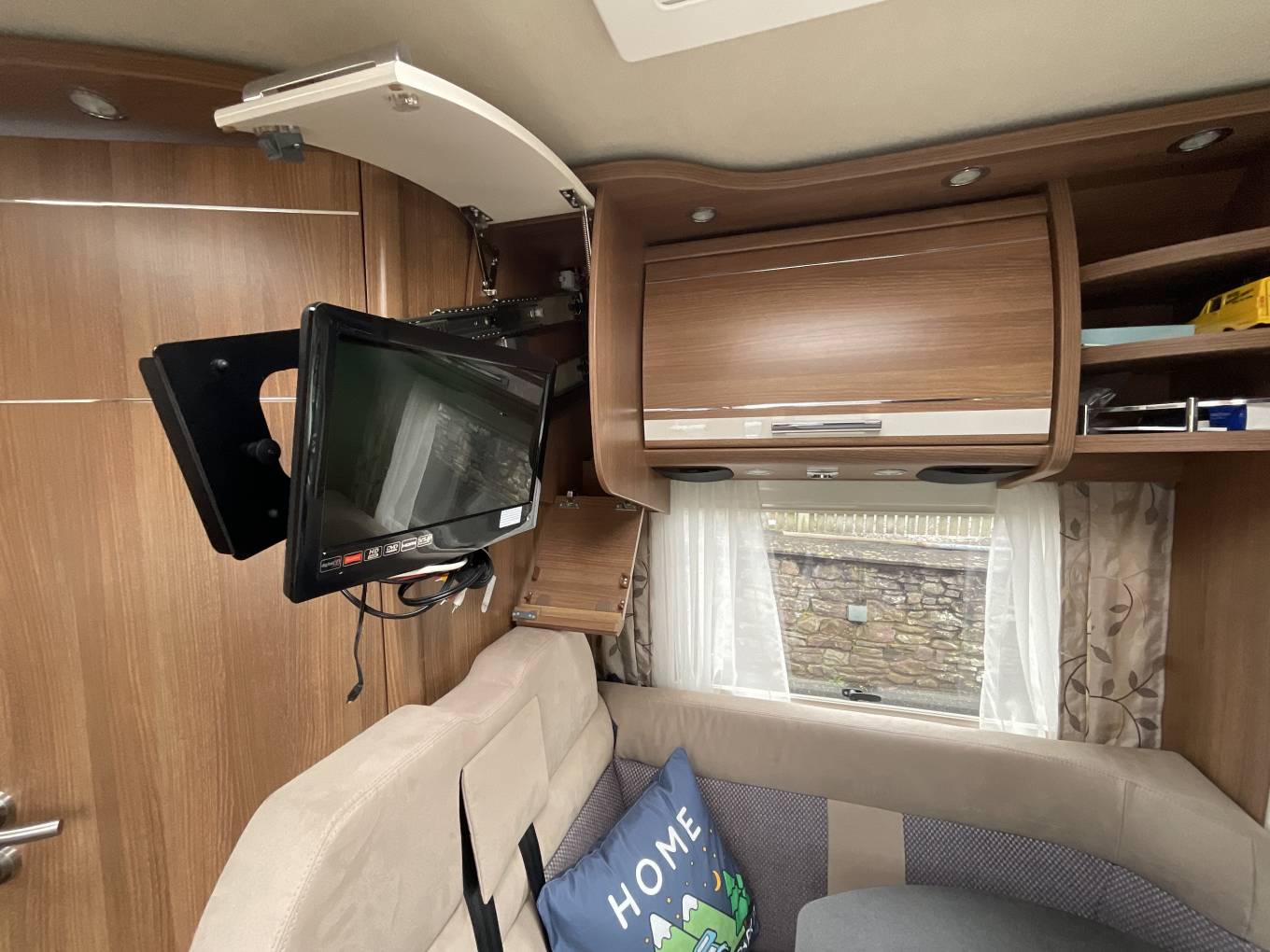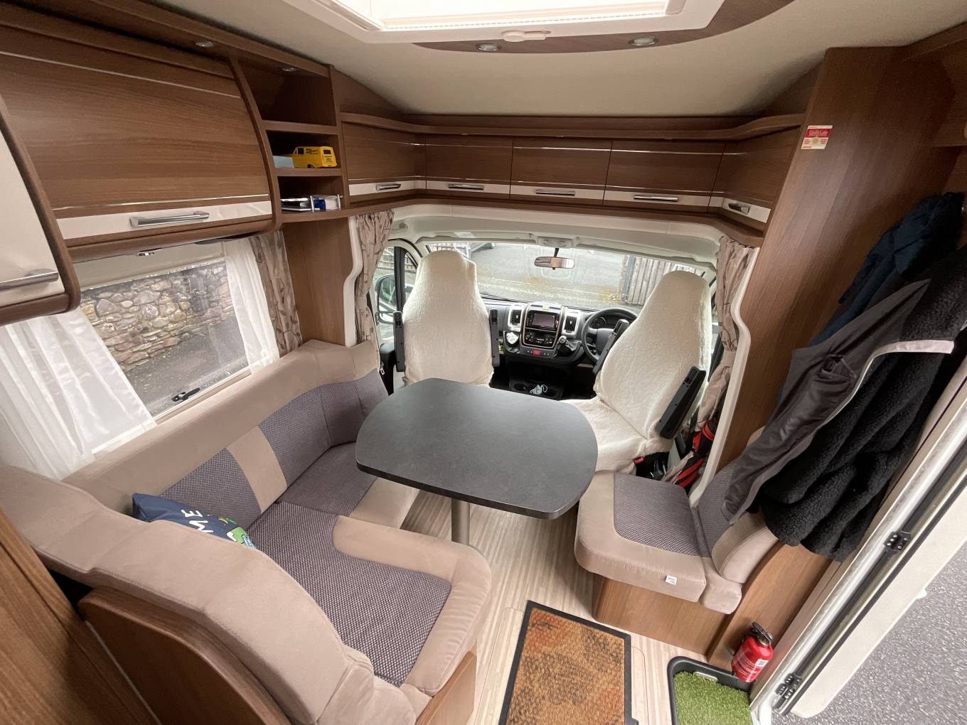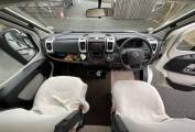 On entering the van through the habitation door you are greeted with a spacious lounge/dinette area to seat 5/6 people when the front cabin seats have been turned around, the two additional travelling seat belts are located here, there are lots of overhead cupboards for storage, plenty of lighting on separate switches to create the perfect ambiance. The TV is concealed in a double opening cupboard that slides out diagonally, there are two windows and one roof light which allows plenty of natural light into the area.