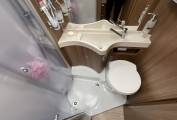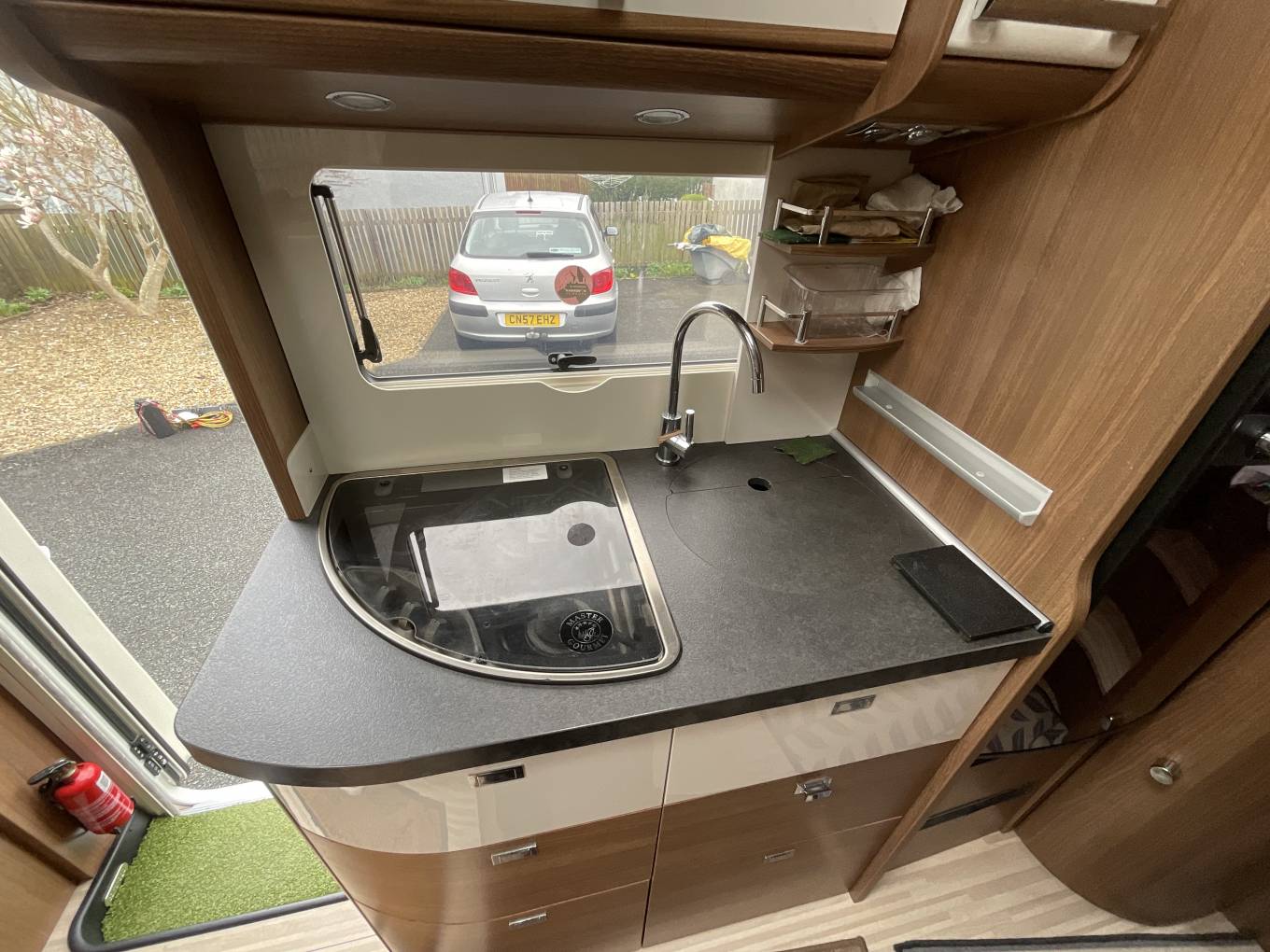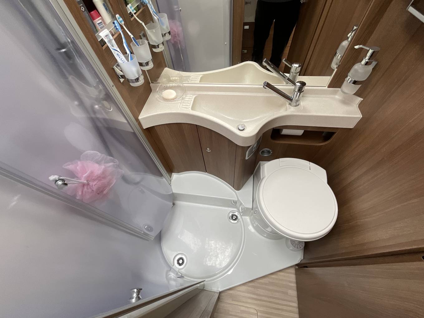 Next we have the washroom with a curved shower enclosure, there is a large mirror, two storage cupboards, three shelves, towel rail, toilet roll holder, a shaped wash hand basin with chrome mixer tap, automatic thetford cassette toilet with a SOG ventilation system to prevent any odors. The kitchen area has lots of storage with six drawers below and two cupboards above, the sink has a chrome mixer tap with a removable cover that turns into a draining board, the Master Gormet Hob has three burners with cast coverings, There is a large fridge with a large separate Freezer box inside the fridge.