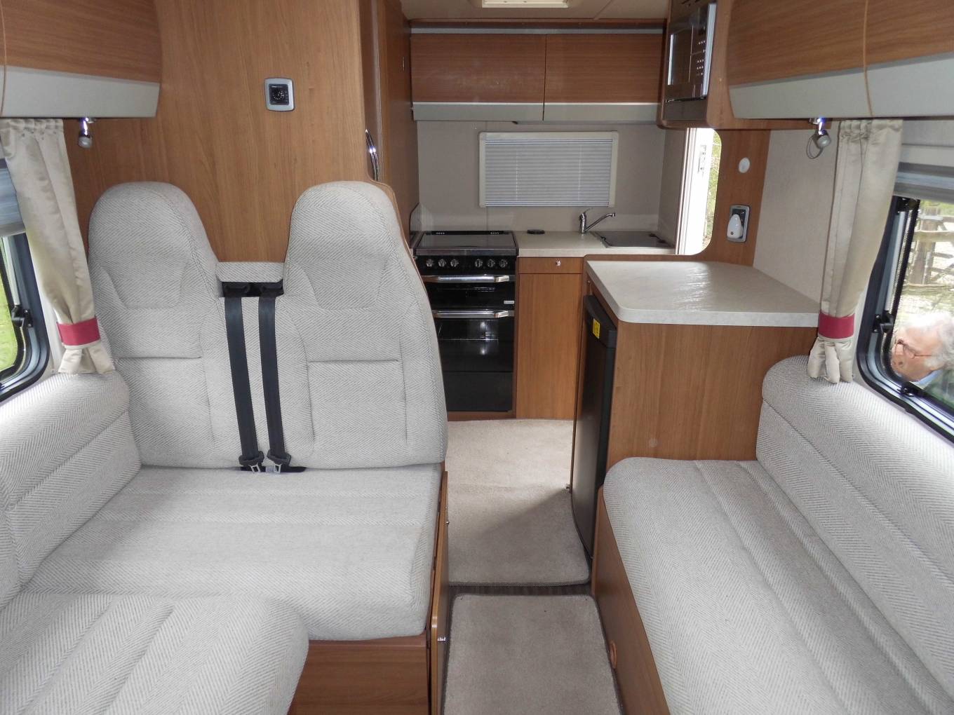 There is an abundance of light and a feeling of space in the living and dining area which is down to the two large windows, sunroof and the seating configuration. The layout comprises of a long side bench and double facing dinette seats. The forward-facing seats have two 3-point travelling seatbelts. With the addition of the two Captain seats and drop-down TV, this area is perfect to dine or relax in.