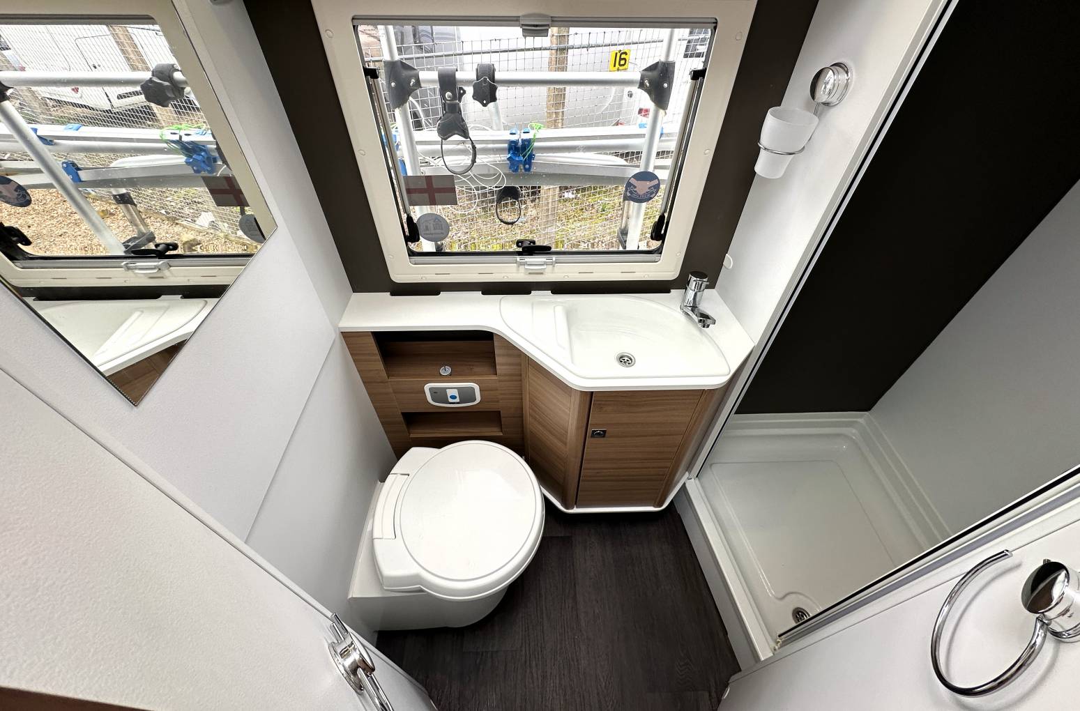 shower cubicle, Thetford cassette toilet and vanity hand wash basin. The wardrobe