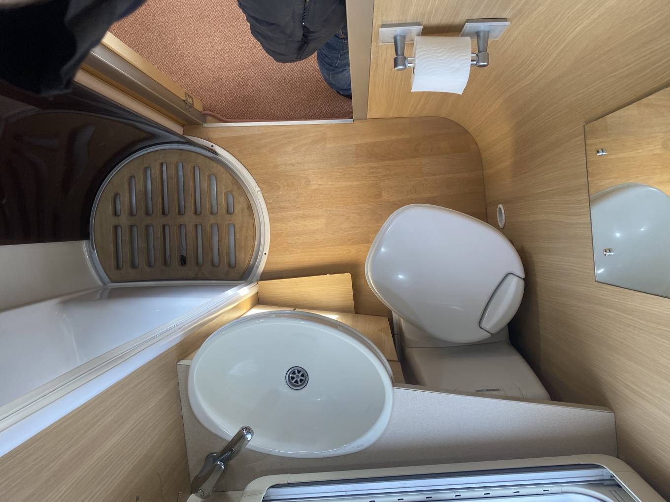 bathroom area complete with toilette cassette, wash basin, vanity mirror, and