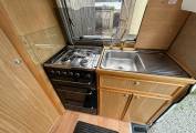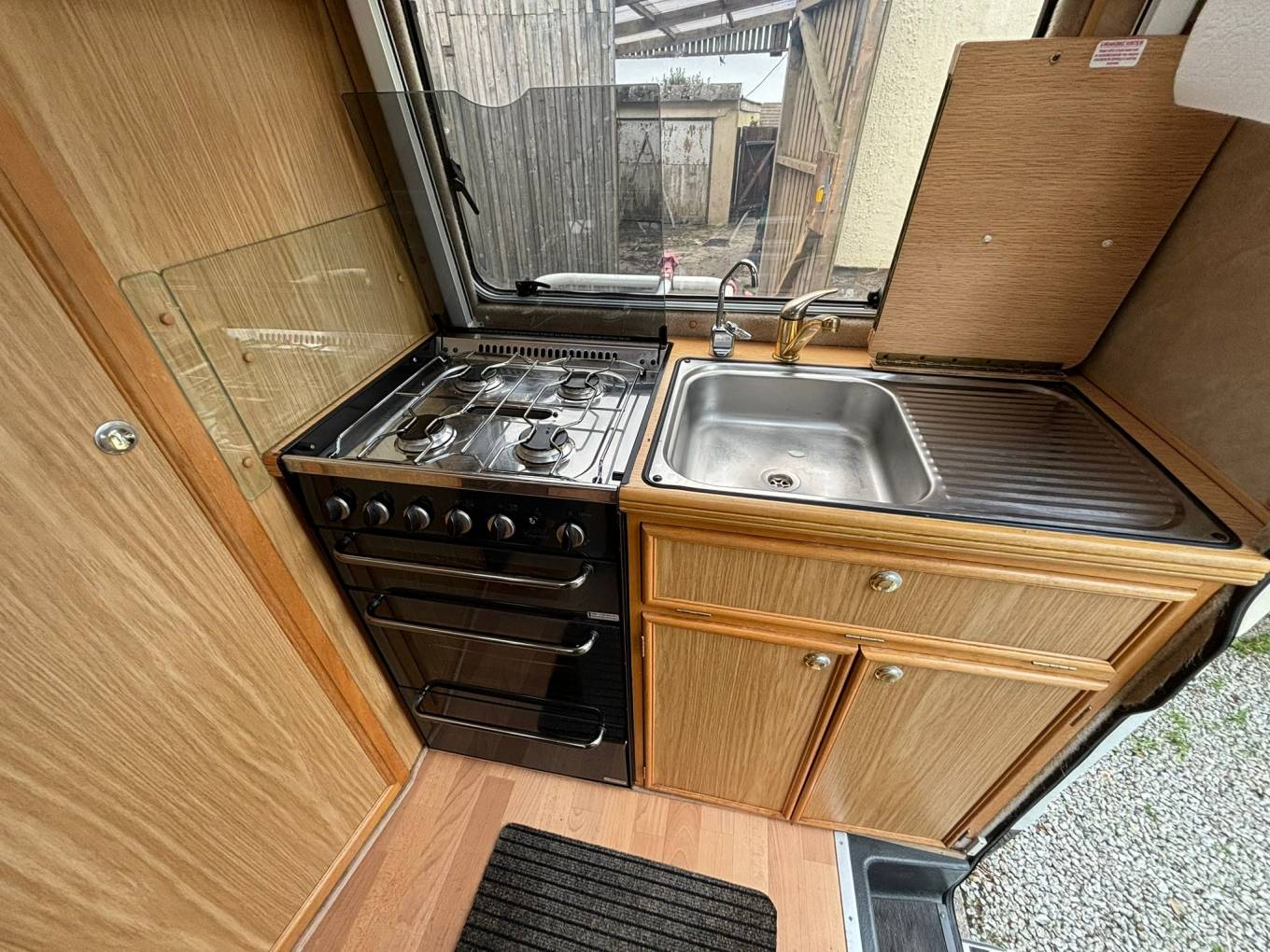 As you enter through the habitation door, the kitchen is immediately on your right, this is built up of a 4 Gas burner, large sink with mixer taps, full oven with separate grill and a 3-way fridge. The washroom is located to the left of the kitchen and has a good-sized shower tray, a Thetford cassette toilet, a fold-down washbasin with mixer tap, a separate tap for the shower handset that mounts on a rising rail and vanity mirror.