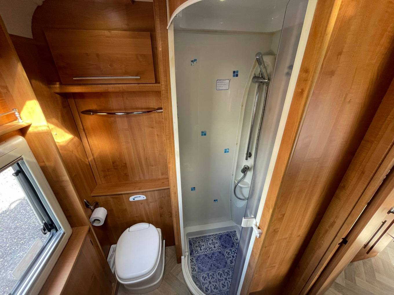 At the rear there is a very spacious washroom with lots of storage space and cupboards. It also has a sink, cassette toilet and separate shower. Externally, this vehicle has all the essentials including a canopy awning, roof ladders, bike rack, reverse camera, refillable gas bottles and external shower for washing down your boots and pooches.