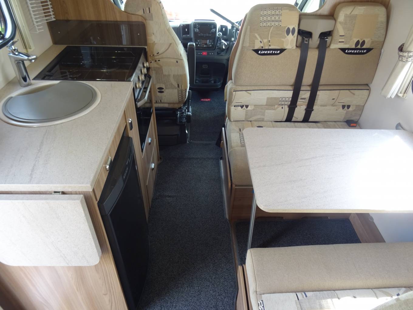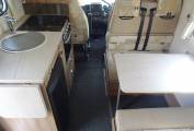 The offside diner has 2 facing twin belted seats, the table can be removed if preferred and this also converts into a double bed (5ft10" x 4ft 9"). The rear facing double seat has storage underneath. The kitchen is well equipped with: microwave, large Thetford oven/grill, with 3 burner gas hob, 3 way fridge with freezer box, sink, drainer and mixer tap, and there is a lift up work top extension and also good all round storage. Our 3rd double bed (6ft 8" x 4ft 6") is over cab with side window, ladder up, and safety retainer. The rear section pushes up for head room.