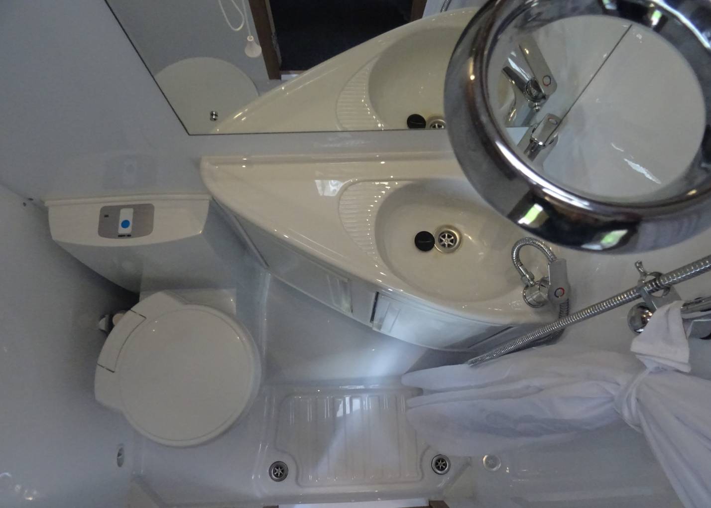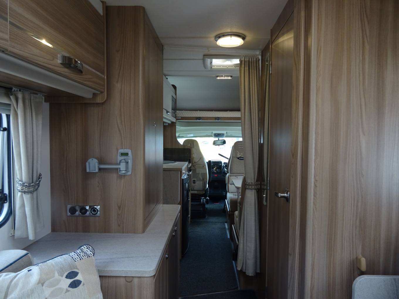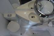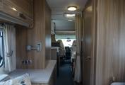 The rear lounge easily converts into a large double bed (6ft 8" x 4ft 3") is very comfortable and light with over head lockers, shelving, and under seat storage, there is a table with its own neat storage point and a 12v TV. Moving up, the spacious offside washroom has integrated shower, electric flush toilet, basin with shower curtain, mirror and storage. Opposite is a large hanger wardrobe with good cupboard space underneath. Mid way there is an overhead 2 way fan.