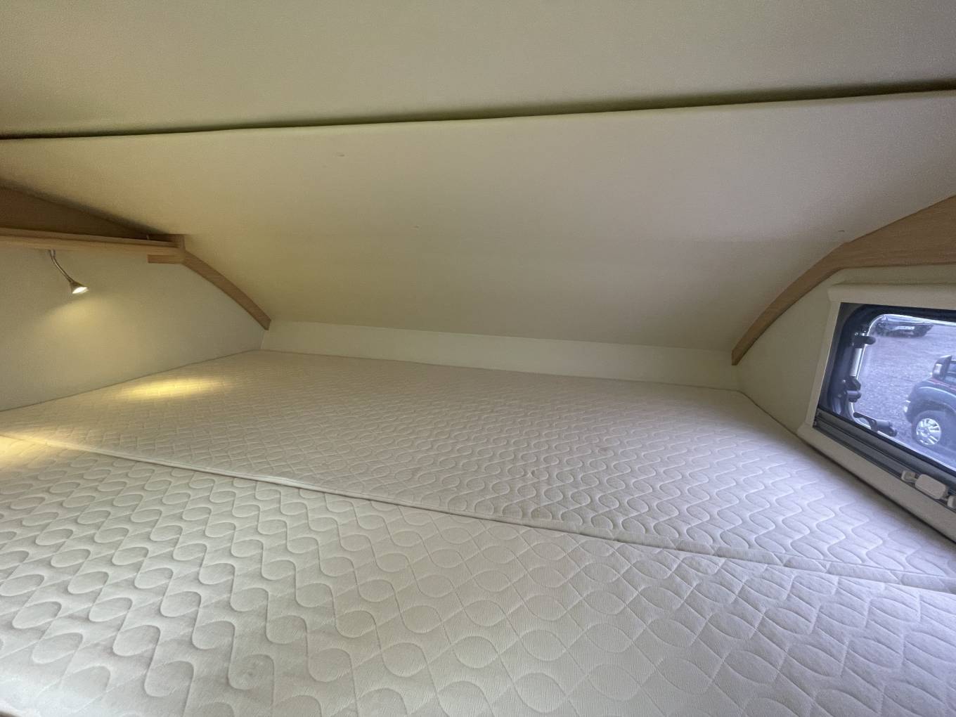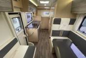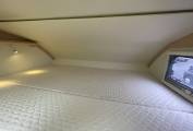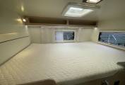 Beds - An out-and-out family motorhome, the six-berth Koala Elite 722 offers buyers three large double beds: a transverse one in the rear, one above the driver’s cab and another double formed by dropping the lounge table and rearranging the cushions on top. The rear bed has a headboard on the offside, with a reading light provided, while the overcab also features an electric light, in this case on a stalk and mounted on the nearside. Access to these berths is access via a ladder, and a curtain will provide night-time privacy. Another curtain is available for the rear transverse bed.