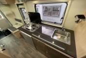 Kitchen - The 722’s galley is located on the offside and is reasonably generous in length. A hob with three gas burners is located on the end of the kitchen unit, with a sink with mixer tap mounted at the opposite end.To save space for storage, Rimor’s designers have favoured a 150-litre energy-control compressor fridge with built-in icebox, which is mounted under the cooker. A rooflight placed in the gangway between the fridge and the washroom will allow steam and cooking smells to exit the vehicle easily.