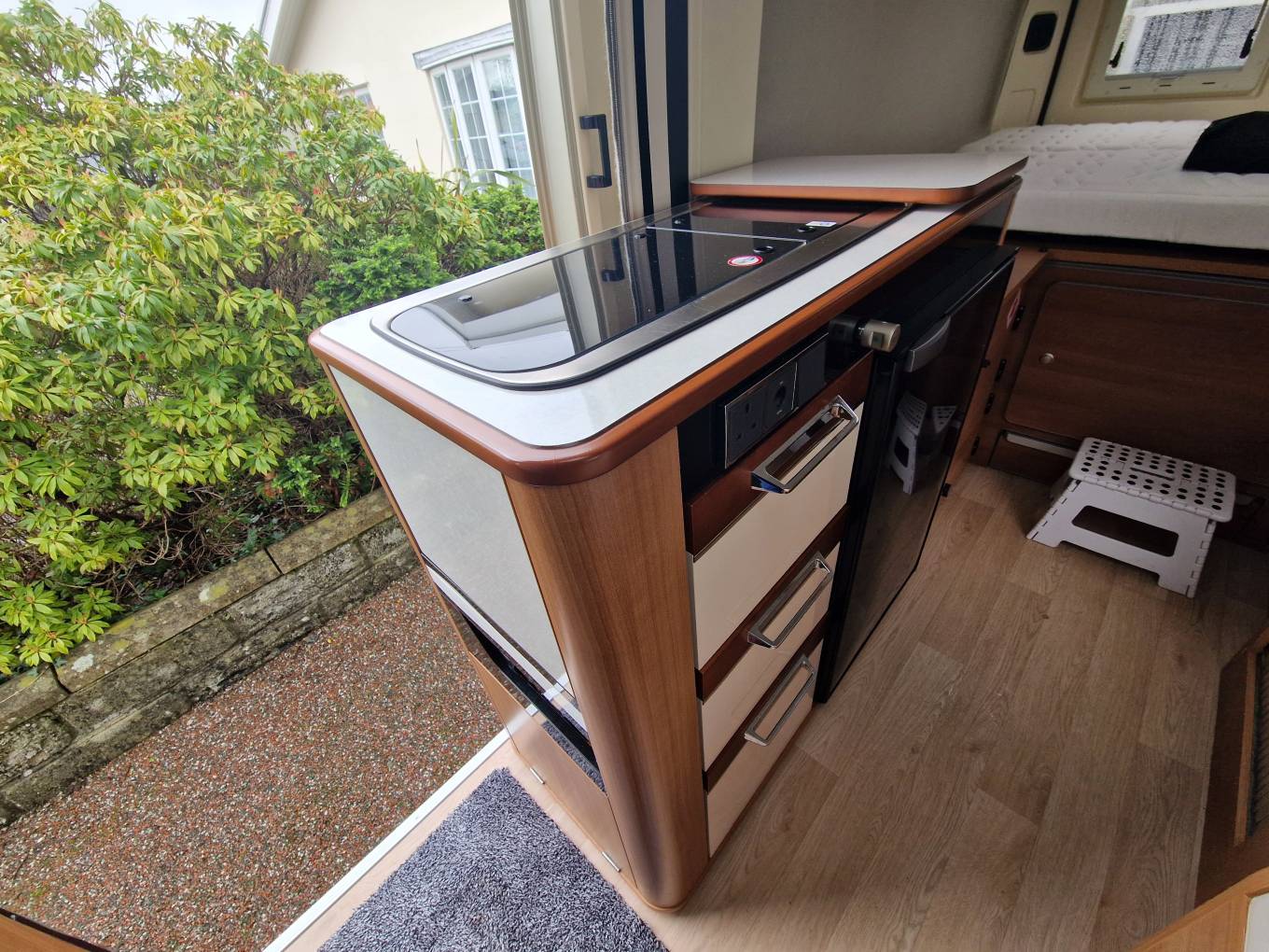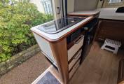 There’s also the option to convert the front half-dinette lounge into a transverse single berth, using the table and a roll of slats as support. Up front (alongside the sliding door), there’s a compact galley with a worktop extension flap at each end. Fittings include a combi hob/sink unit with two gas rings and spark ignition.