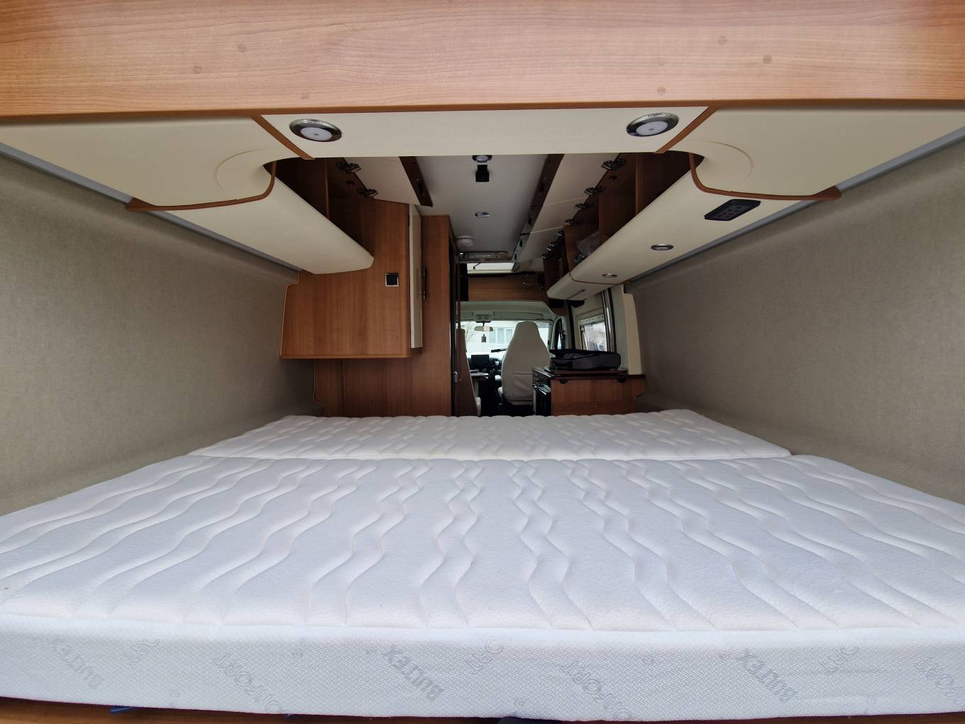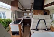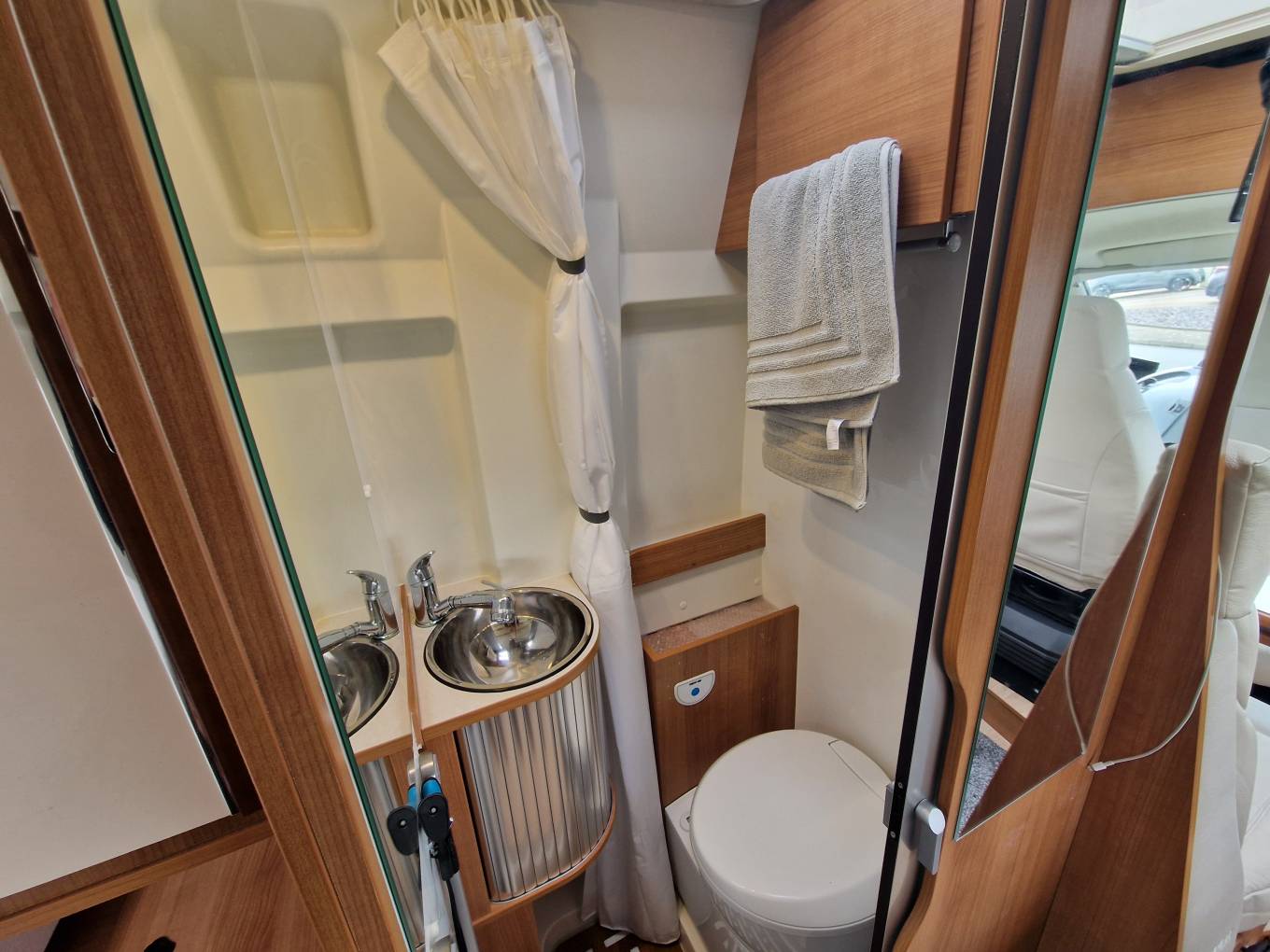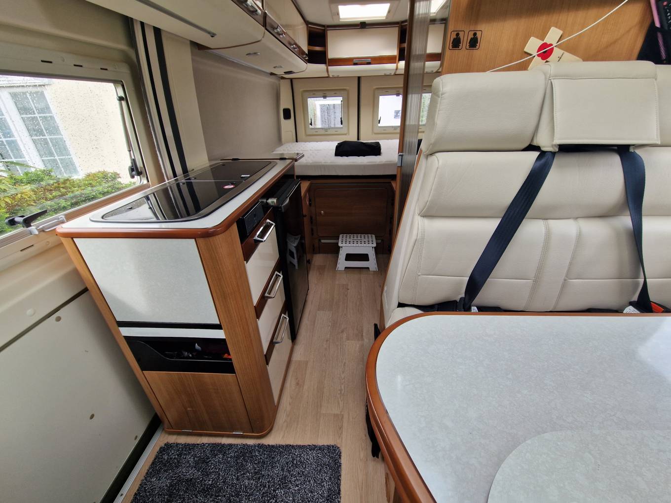 The half-dinette has a very impressive finish of its upholstery and has 2 seatbelts and the table has a folding leaf. The washroom area comes with the latest Thetford swivel cassette loo and a stainless-steel corner washbasin along with the shower. A tambour door won’t get in the cook’s way and there are all the usual accessories (towel rail, hooks, toothbrush mug).