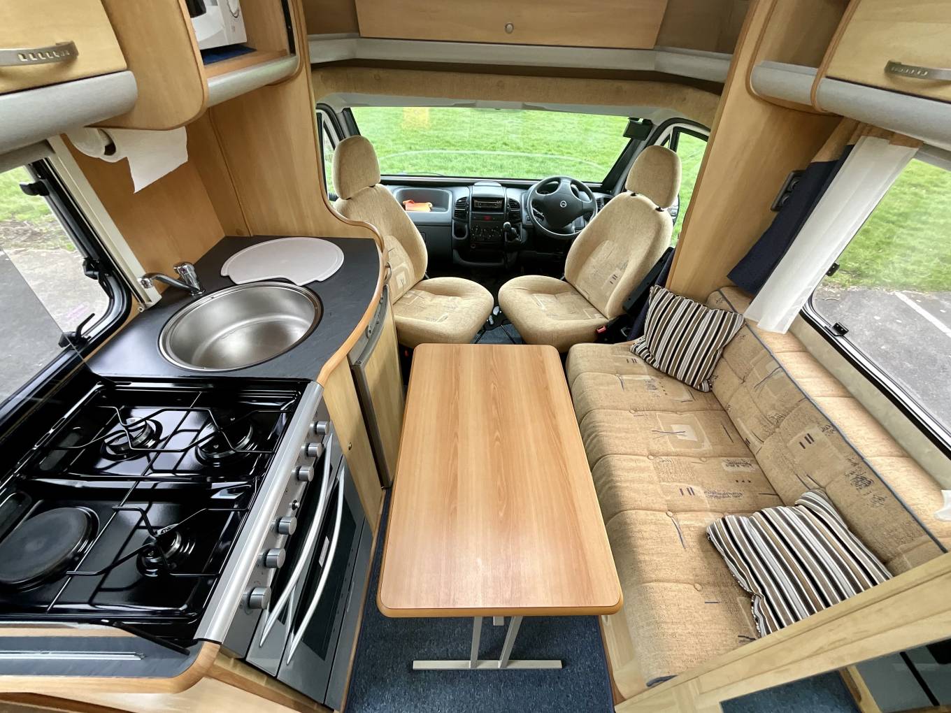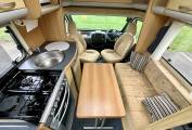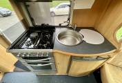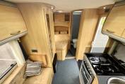The kitchen comes fully equipped with a large Dometic fridge with freezer, gas hobs with one electric hot plate, sink, microwave and plenty of storage for cutlery, condiments and crockery.