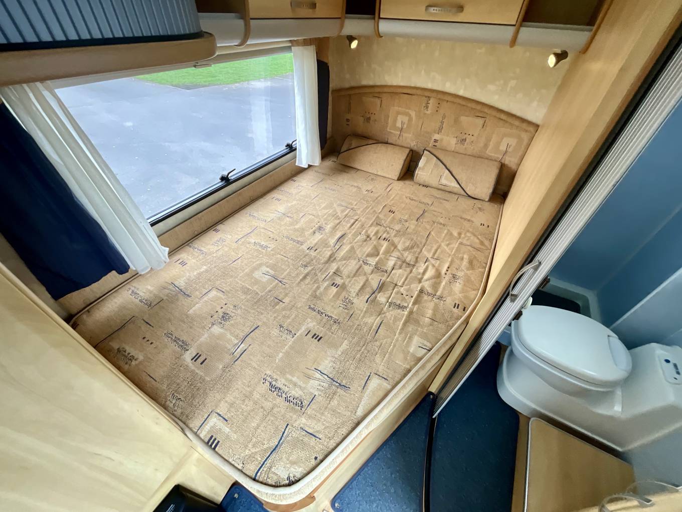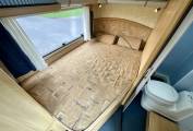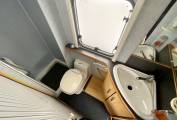 Towards the back of the vehicle, you have the sizeable french bed, beneath which you have additional storage. Opposite, the sliding door opens up to a large washroom featuring Thetford toilet with cassette, shower with screen, washbasin, vanity unit and storage.