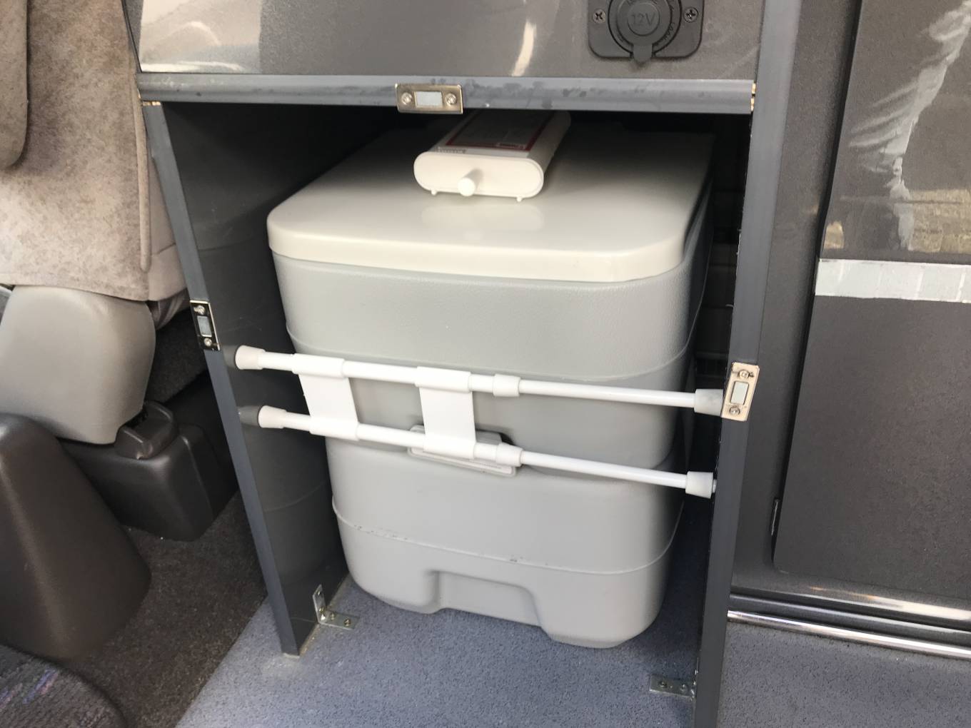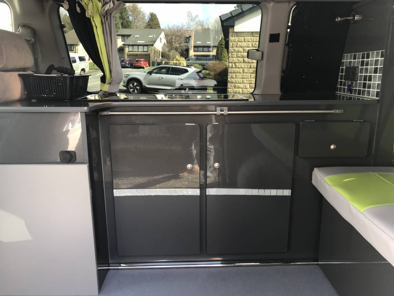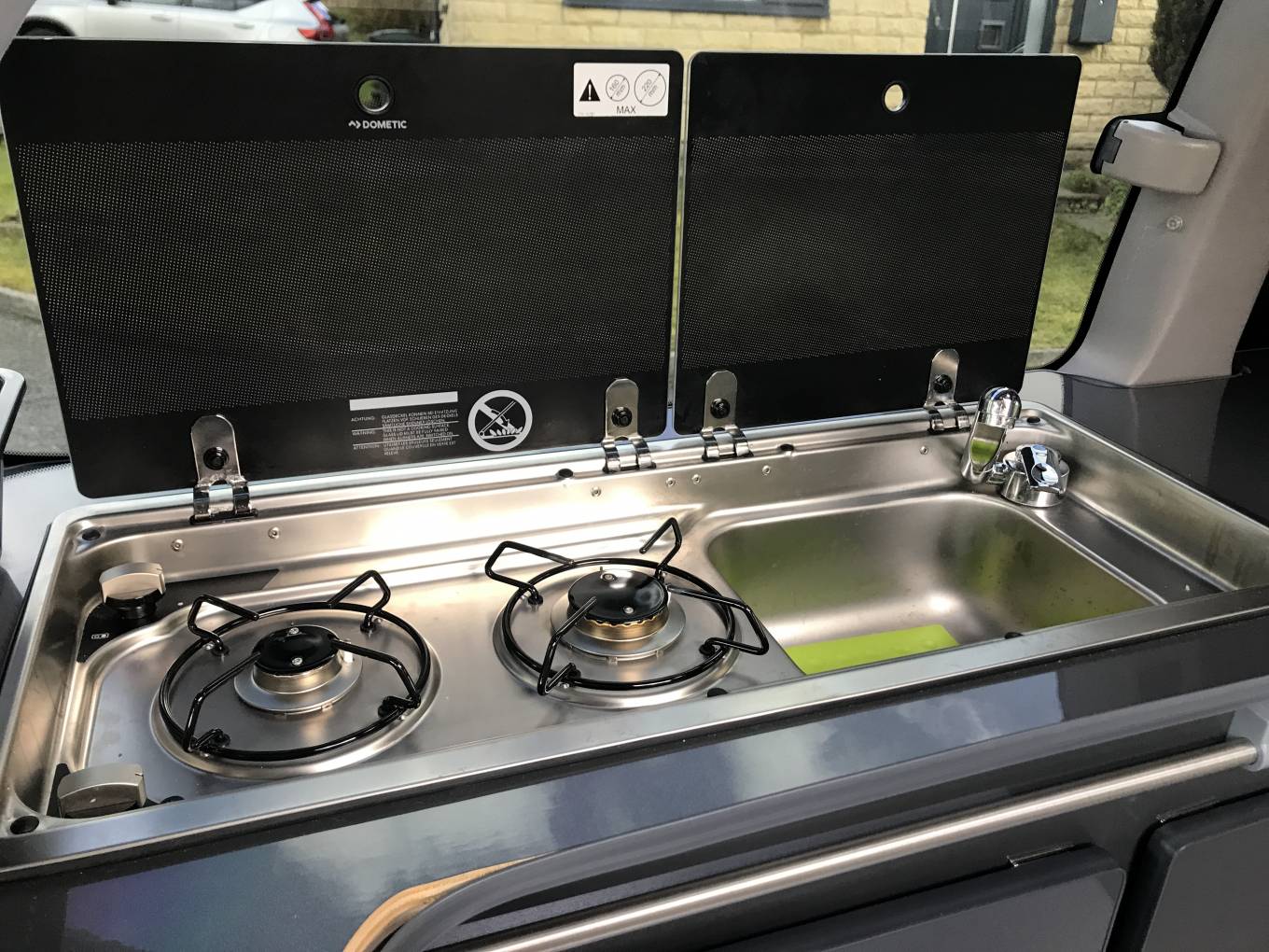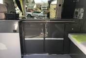 Full side kitchen conversion with a Dometic 2 ring gas hob and sink, 2 camping gas bottles plus fresh and waste water containers. There is also room for either a Fridge or a portable toilet.