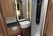 The wash room is modern with cubicle shower, mixer taps on the modern sink, cassette toilet, large mirror and vanity unit