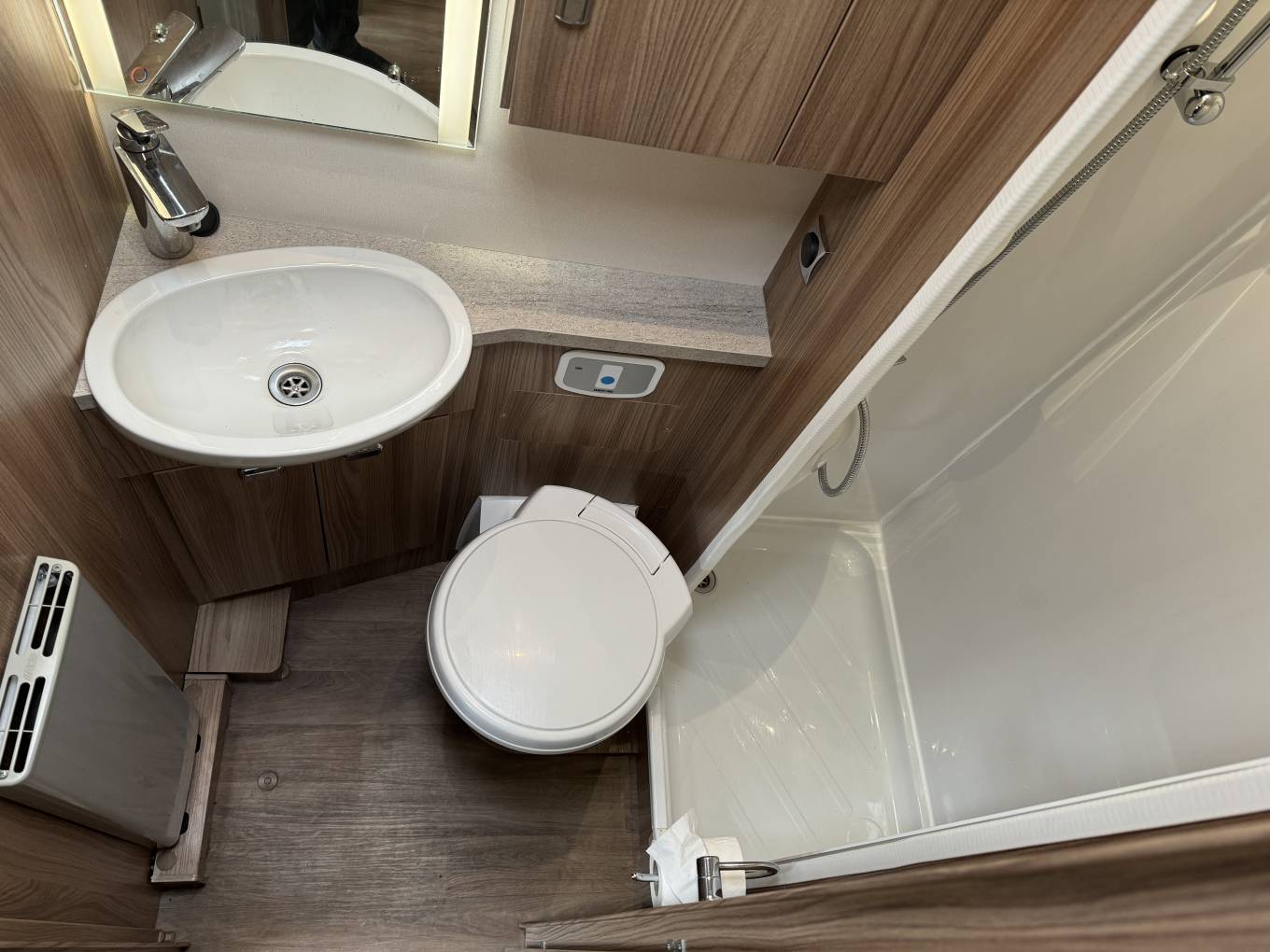 washroom with the walk in shower cubicle, Thetford swivel cassette toilet with