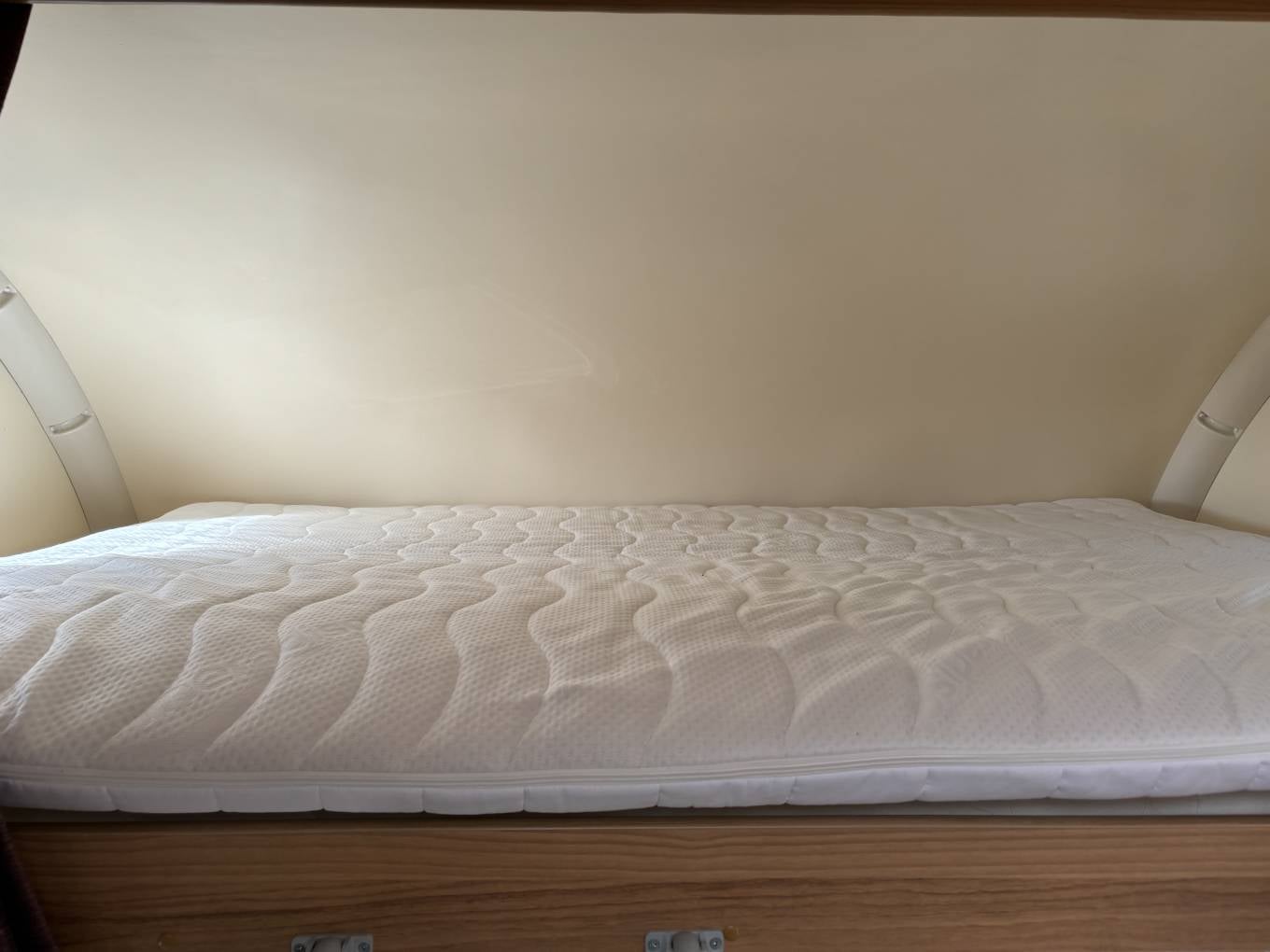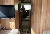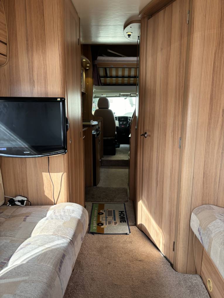 The cab at the front has ample room and a comfortable driving position and both seats swivel to add to the seating for the dinette area behind and above the cab there is a double bed which sleeps two people with ease. Extras include a television and a bike rack.