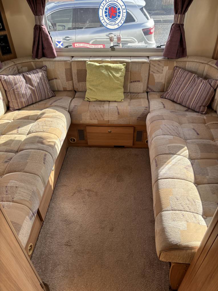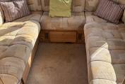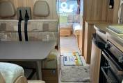 The layout consists of a U-shaped lounge at the rear which converts into a double bed as two of the six berths. To the front of the living area there is a dinette with four belted seats which also converts into a double bed. There are lots of cupboards and overhead lockers dotted around the motorhome as well as a wardrobe to hang your clothes up, within which there is also a safe to store any precious belongings.