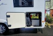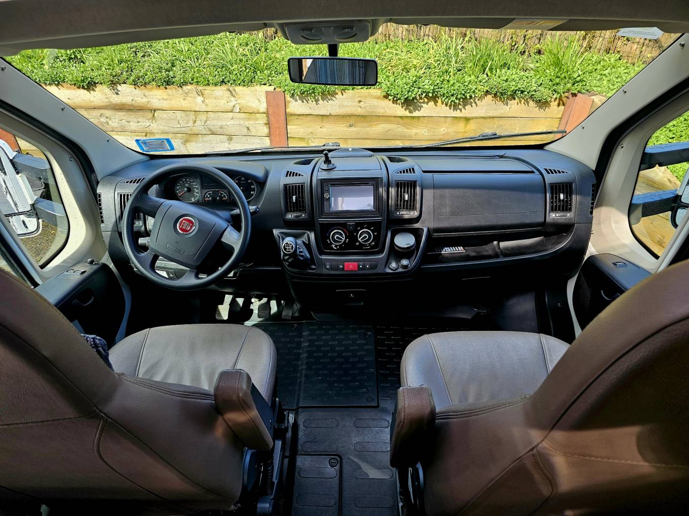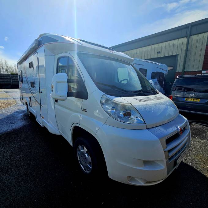 This stylish 2015 Burstner Nexxo T 729 comes with low miles and a specification of two single beds over a large rear garage, the option to make another occasional; bed in dining area. This 130 bhp 2.3L Fiat based motorhome comes with a 6-speed manual gear box and four travel seats. The two front pilot seats come with swivel features to allow more space in the L-Shape dinette area with side seat. The L-Shape kitchen unit comes with a sink, three gas hobs, an oven/grill and a fridge/freezer. The side bathroom unit comes with a sink and a toilet with a separate shower room opposite. Vehicle accessories include: Blaupunkt audio unit, cab air-con, cruise control, wind out awning and satellite TV system.