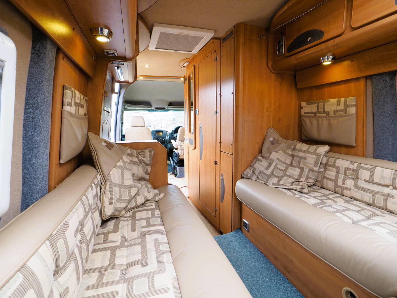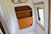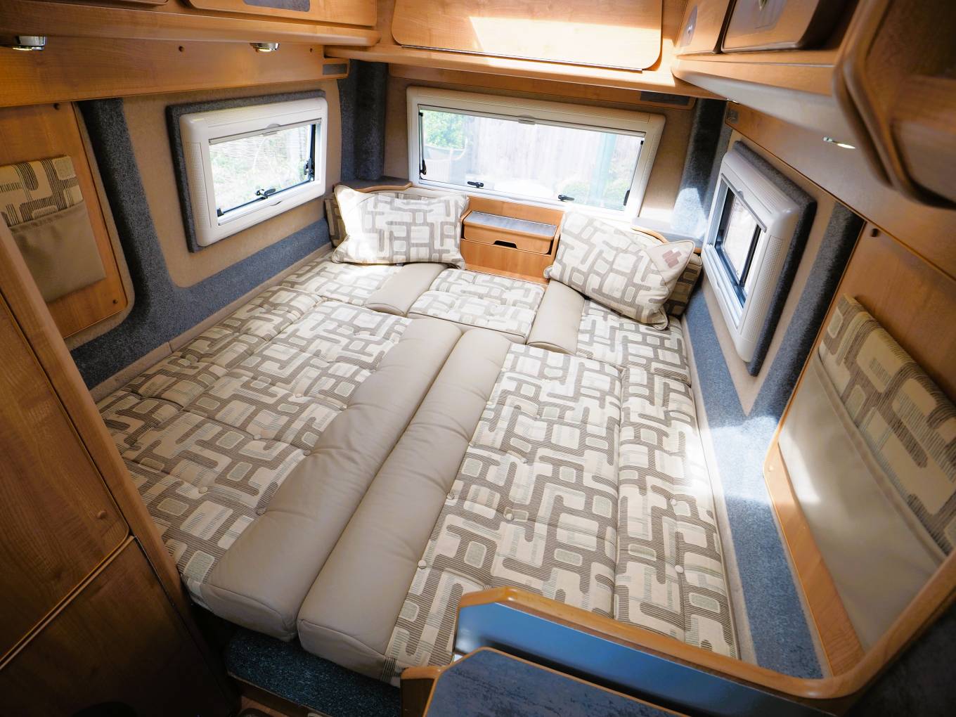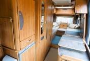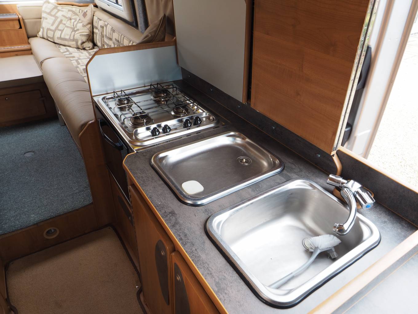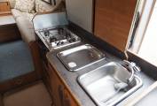 A rear lounge area with large half leather side sofas provides a comfortable place to relax. Plenty of natural light from the windows to three sides and an overhead skylight. All are fitted with blinds & flyscreens. Drop in the occassional dining table for eating, drinking & entertaining . Come bedtime the sofas can be set up as two good sized single beds or swiftly converts to a huge double bed. Kitchen area includes a 4 burner gas hob above a large oven and grill. Sink with hot and cold mixer tap and separate drainer. An extendable work surface increases preparation space. A 3-way Dometic fridge with separate freezer box gives plenty of space for your chilled food and drink needs. Cupboards to both sides provide plenty of storage and there is a pull out work surface which cleverly lifts to reveal the built-in cutlery drawer. The washroom has a flushable cassette toilet, shower & sink with vanity mirror.
