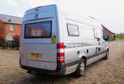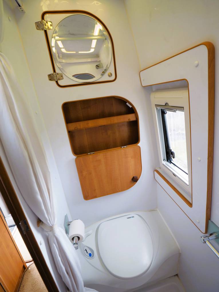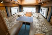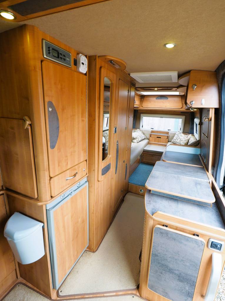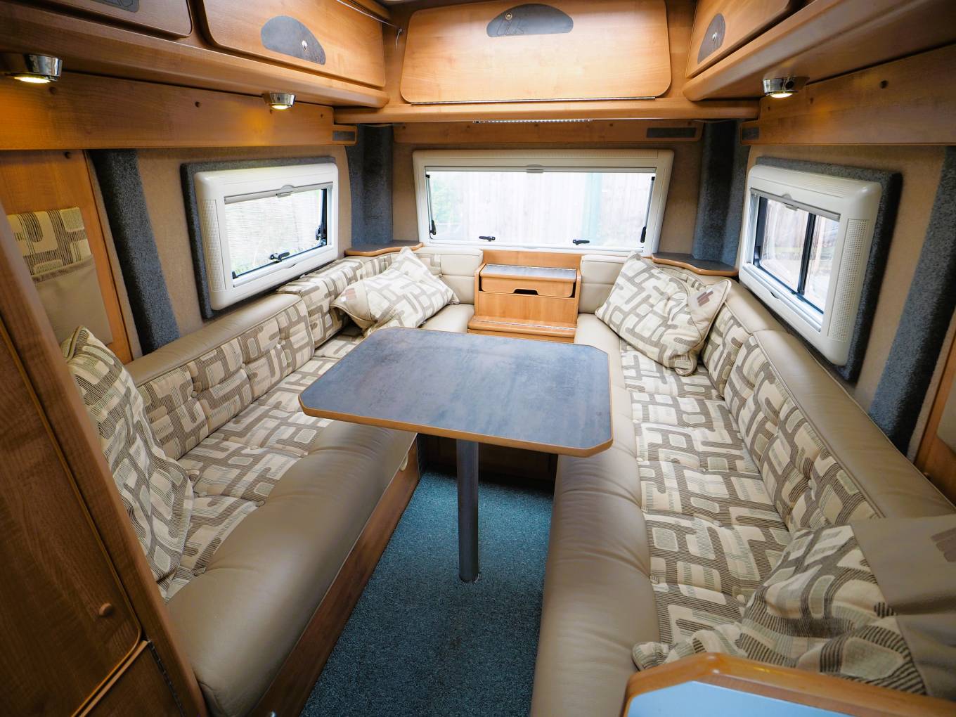 A rear lounge area with large half leather side sofas provides a comfortable place to relax. Plenty of natural light from the windows to three sides and an overhead skylight. All are fitted with blinds & flyscreens. Drop in the occassional dining table for eating, drinking & entertaining . Come bedtime the sofas can be set up as two good sized single beds or swiftly converts to a huge double bed. Kitchen area includes a 4 burner gas hob above a large oven and grill. Sink with hot and cold mixer tap and separate drainer. An extendable work surface increases preparation space. A 3-way Dometic fridge with separate freezer box gives plenty of space for your chilled food and drink needs. Cupboards to both sides provide plenty of storage and there is a pull out work surface which cleverly lifts to reveal the built-in cutlery drawer. The washroom has a flushable cassette toilet, shower & sink with vanity mirror.