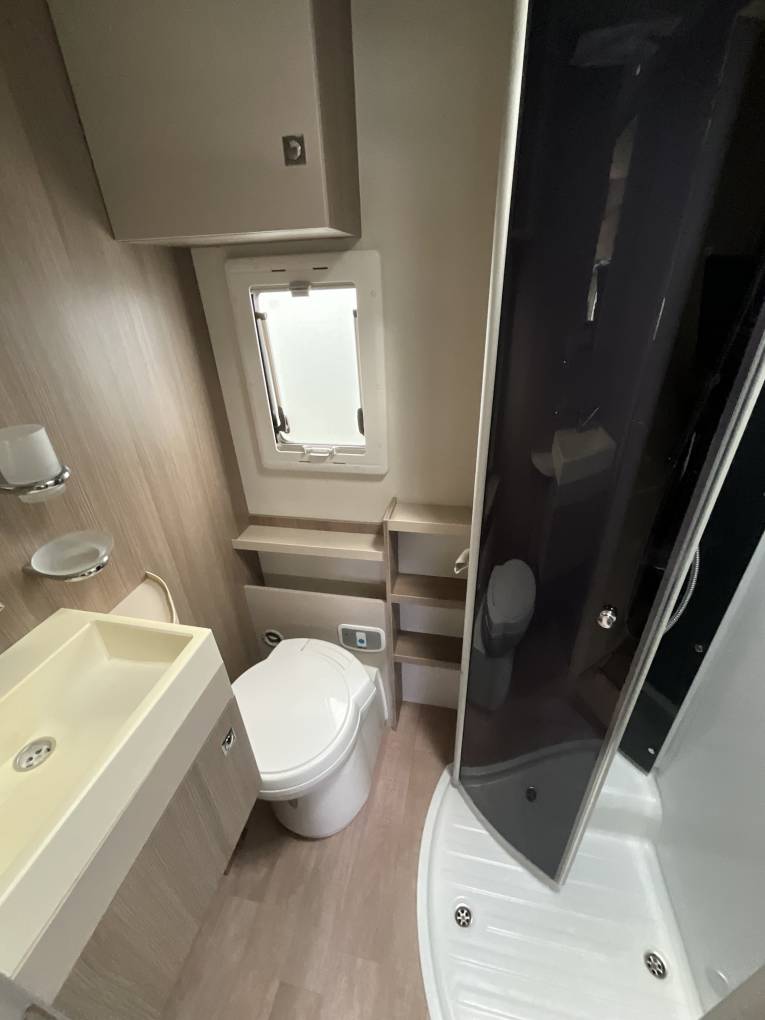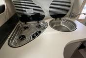 Turning right, on the left is the washroom with toilet, hand basin and enclosed shower. Next to this is the tall fridge with freezer box then there is the wardrobe with fitted TV in the cupboard above. Opposite this is the kitchen area consisting of stainless steel sink with mixer tap and three ring gas hob. Under the sink there is an enclosed grill. On both sides at the top there are lockers for storage