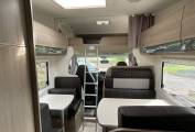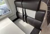 Moving forward there is a large lounge-dining. On the left are two single seats with a table that drops down to form the base for a single bed. Opposite this is seating for 4 people. The double, front facing seat has two 3 point seat belts and the rear facing double seat has 2 lap straps with a table for entertaining