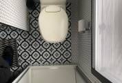 washbasin, the bathroom area is light and spacious. The kitchen area is behind