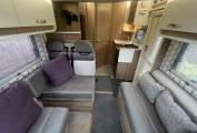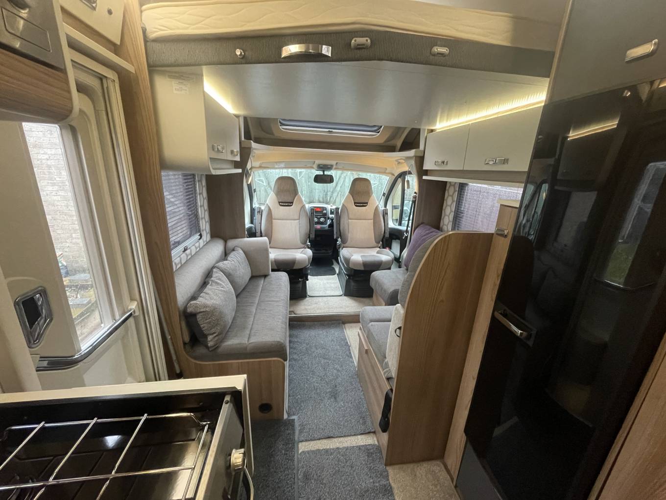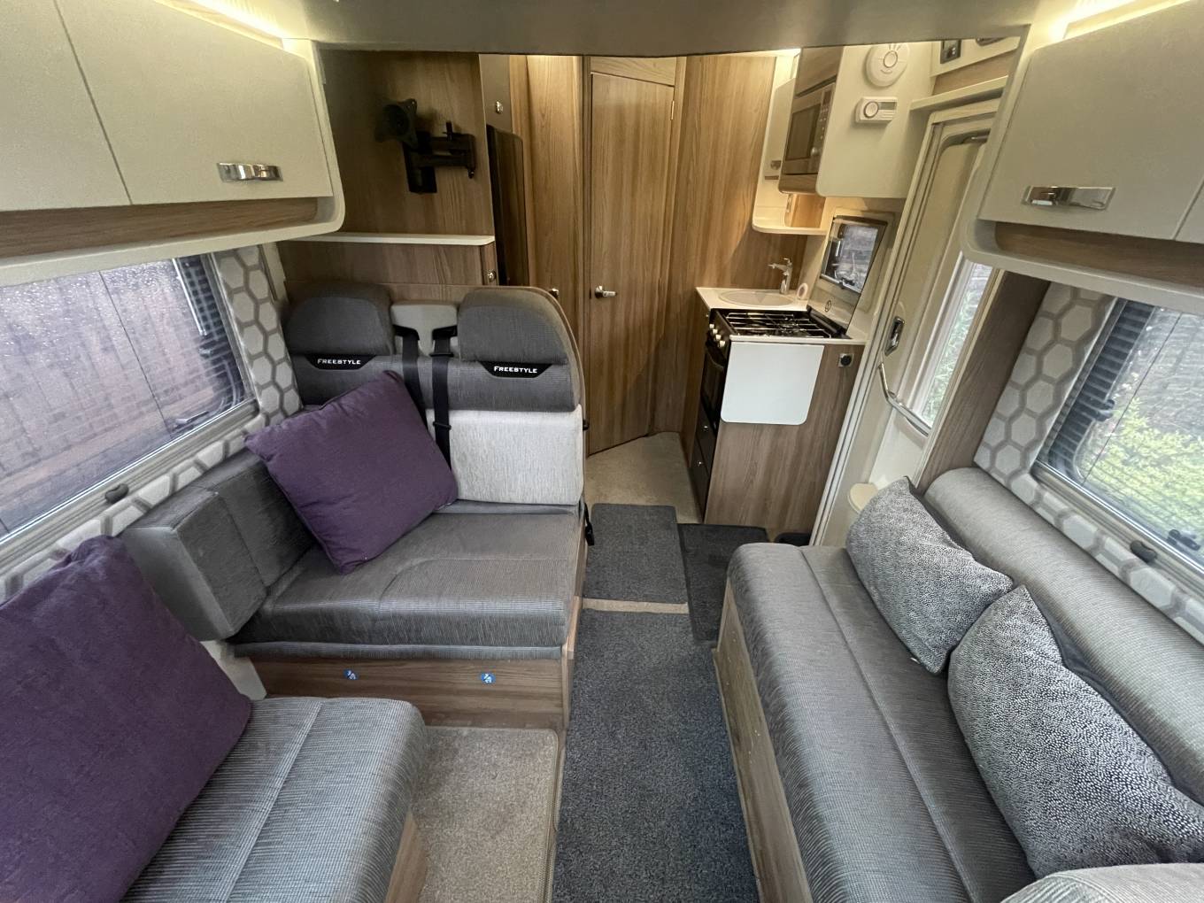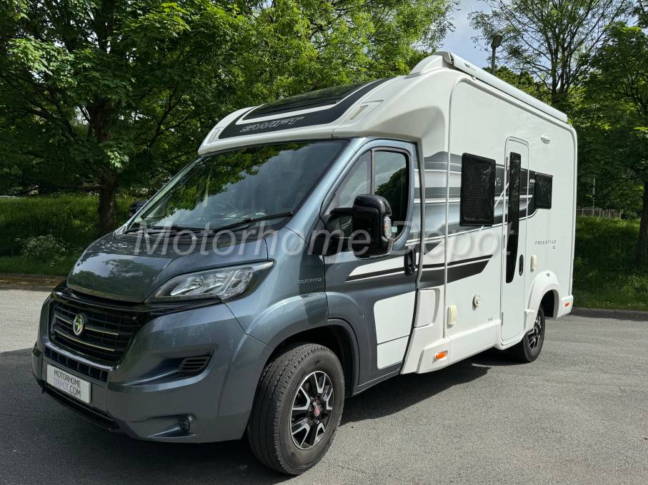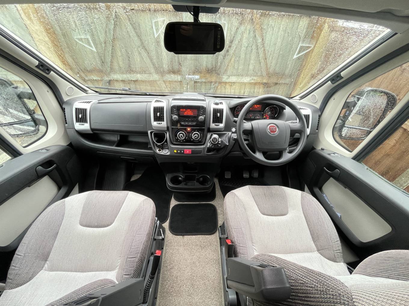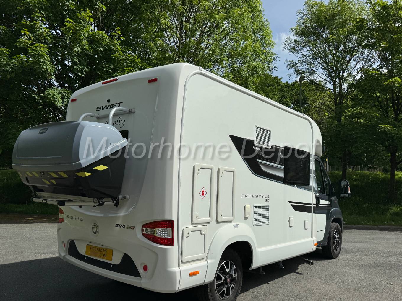 The Swift Freestyle 604 SE is the perfect compact Motorhome which can accommodate 4 people sleeping if required. Based on the ever popular Fiat Ducato chassis with the 2287cc Multijet Diesel engine with the 6 speed manual gear box in the 130bhp form. Having only covered 11534 miles to date it comes with a good mechanical service history last done 05/23 with a Cam Belt just done 04/24 and a new MOT no advisories. Last Habitation check 01/24 from Reliance in Funtington. The cab benefits from: Captains Chairs; Power Steering; Electric Front Windows; Electric Adjustable & Heated Mirrors; Cruise Control; Multi Media Factory Head Unit including Bluetooth Aux & Usb in; Remis Blinds to front screen; Polar Inserts for side windows; Reverse Camera Screen.