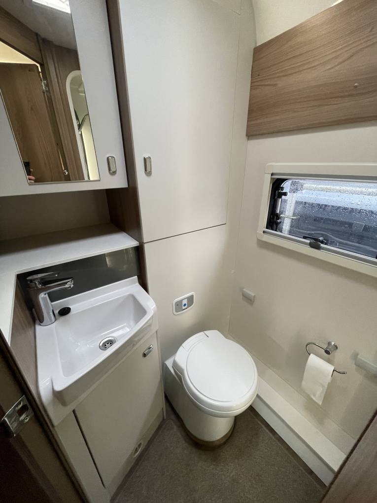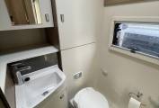 Finally moving rear again is the bathroom which covers the rear of the motorhome. This consists of a white corner sink with chrome mixer tap, plenty of cupboards space; a Thetford cassette style electric fresh water flush toilet. Opposite is a separate shower cubicle with Perspex doors to close.