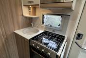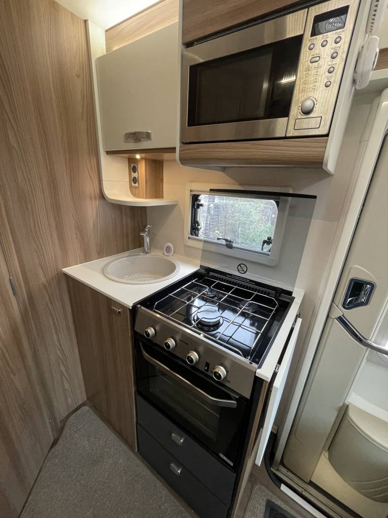 To the right of the habitation door is that galley kitchen which consists: Thetford full size oven and grill with 3 burner gas hob above; White bowl shaped sink with chrome mixer tap; Microwave oven above; a good level of storage for all your holiday provisions.