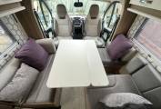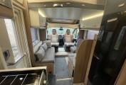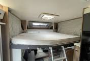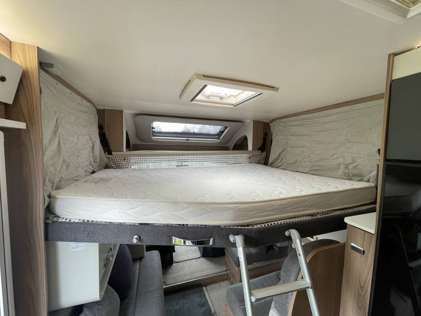 We enter the motorhome on the passenger side, immediately to the left is the dinette which consist of a long sofa near side opposite is a forward facing 2 seater with 2x travelling seat belts. Forward again is a single side sofa, there is a table with extension that can be situated centrally with a removable leg that stores in a rear cupboard. At night this area can be made up into a good double bed for occasional passengers. Over head is the main double bed that drops down manually with a ladder to access.