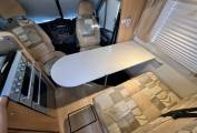 Opposite the kitchen area are twin forward facing belted seats with a side mounted extendable dining table leading to the Twin Swivelling Cab Captains Chairs.