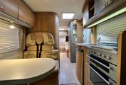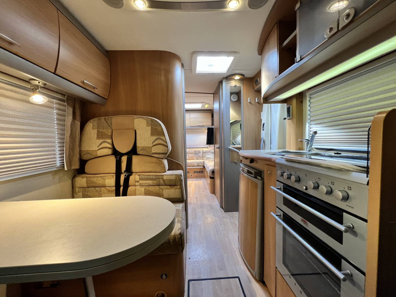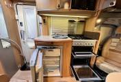 Here you will find a Three Gas Burner and One Electric Hotplate Hob, a separate Grill and Oven, a Three energy source Thetford Fridge, a Microwave Oven, a Sink a with Hot and Cold Mixer Tap and removable drainer, plus loads of cupboard space.