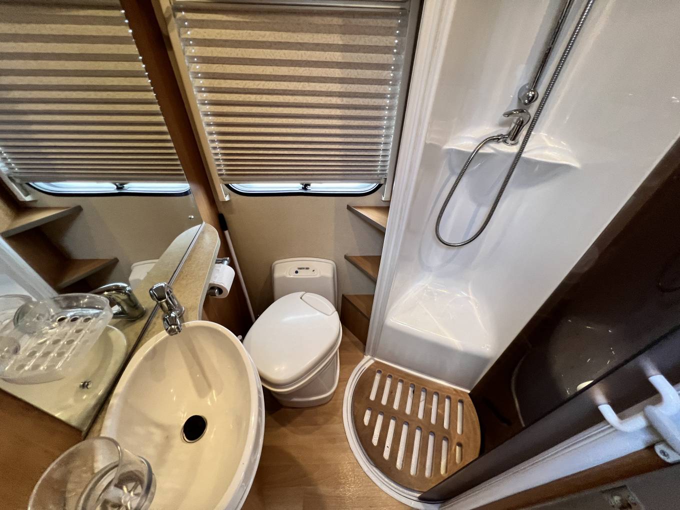 Behind the rear travel seats is the bathroom consisting of a Thetford Flush Cassette Toilet, a Wash Handbasin and a circular Shower Cubicle, plus storage cupboards.