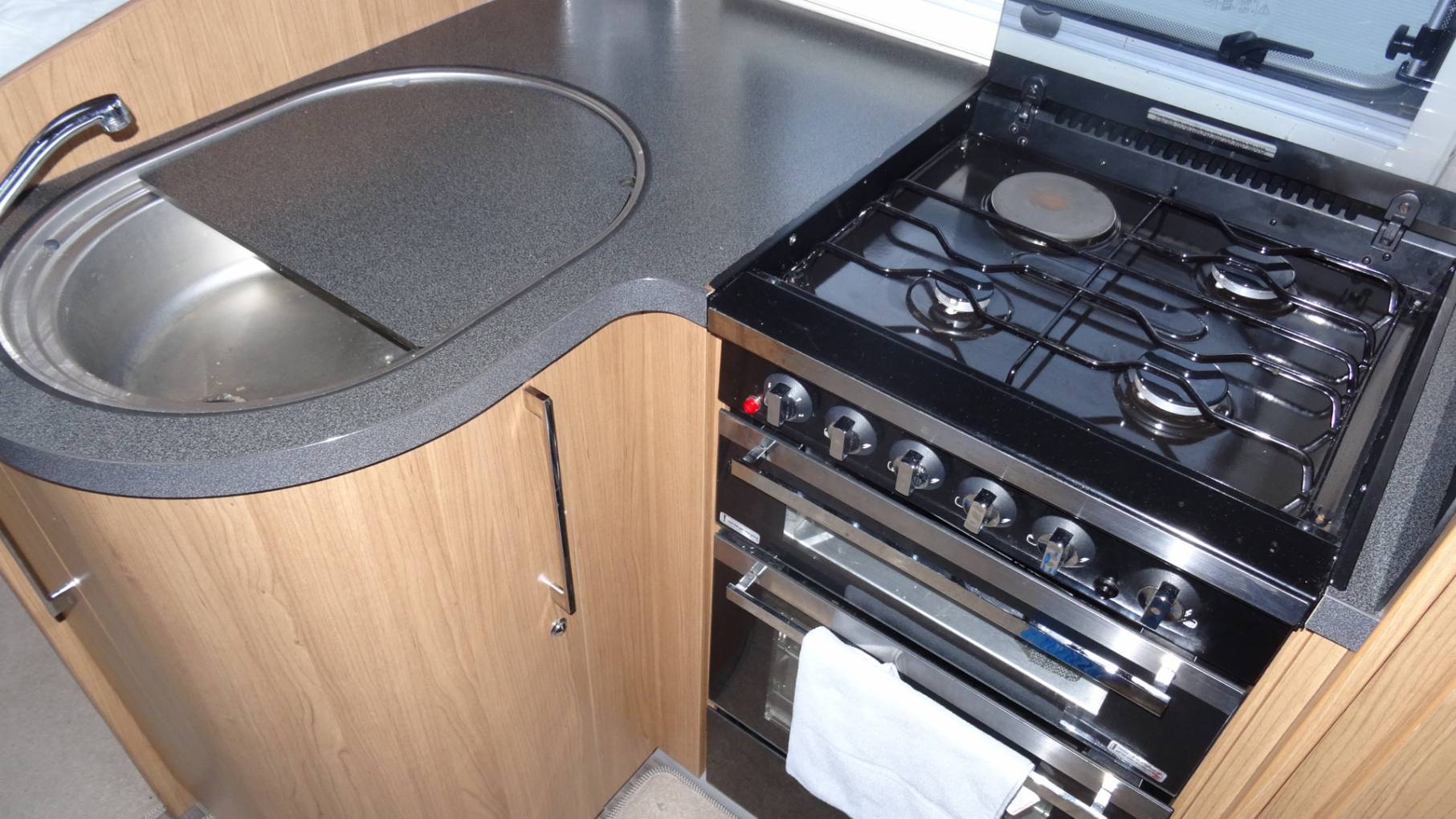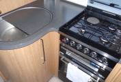 door is the L-shaped kitchen area with 3 burner hob and electric hotplate, oven, sink and microwave above. There is plenty of storage above and below. Next comes a