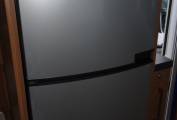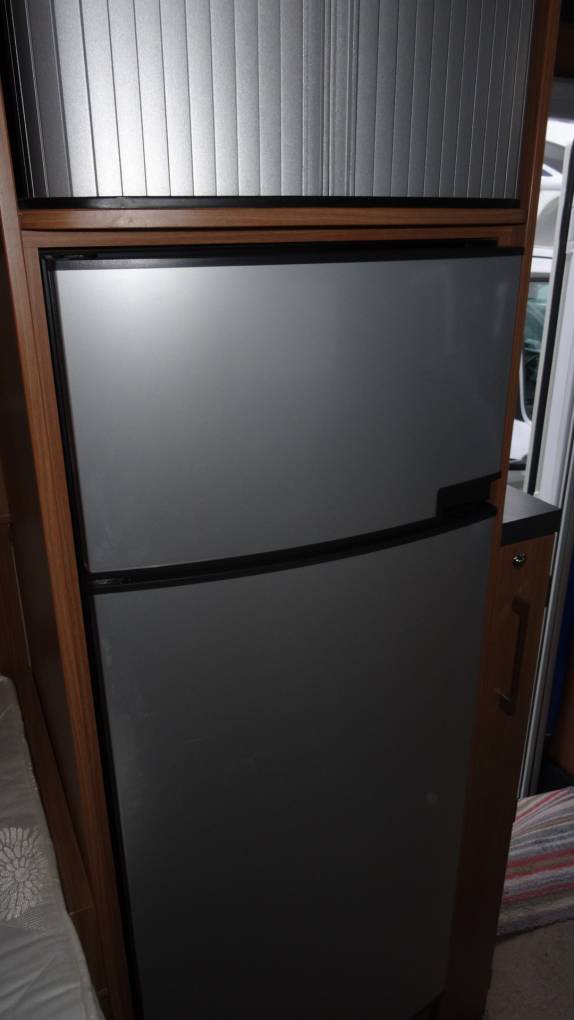of the habitation door is a large fridge with separate freezer compartment.
