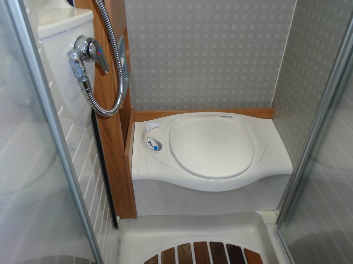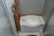 The Bathroom is light & spacious, it has a Thetford Fresh water flush cassette toilet which can be sectioned off from the shower via perspex doors front and rear. There is a built in wash hand basin with Chrome mixer tap and separate cupboard above the toilet.